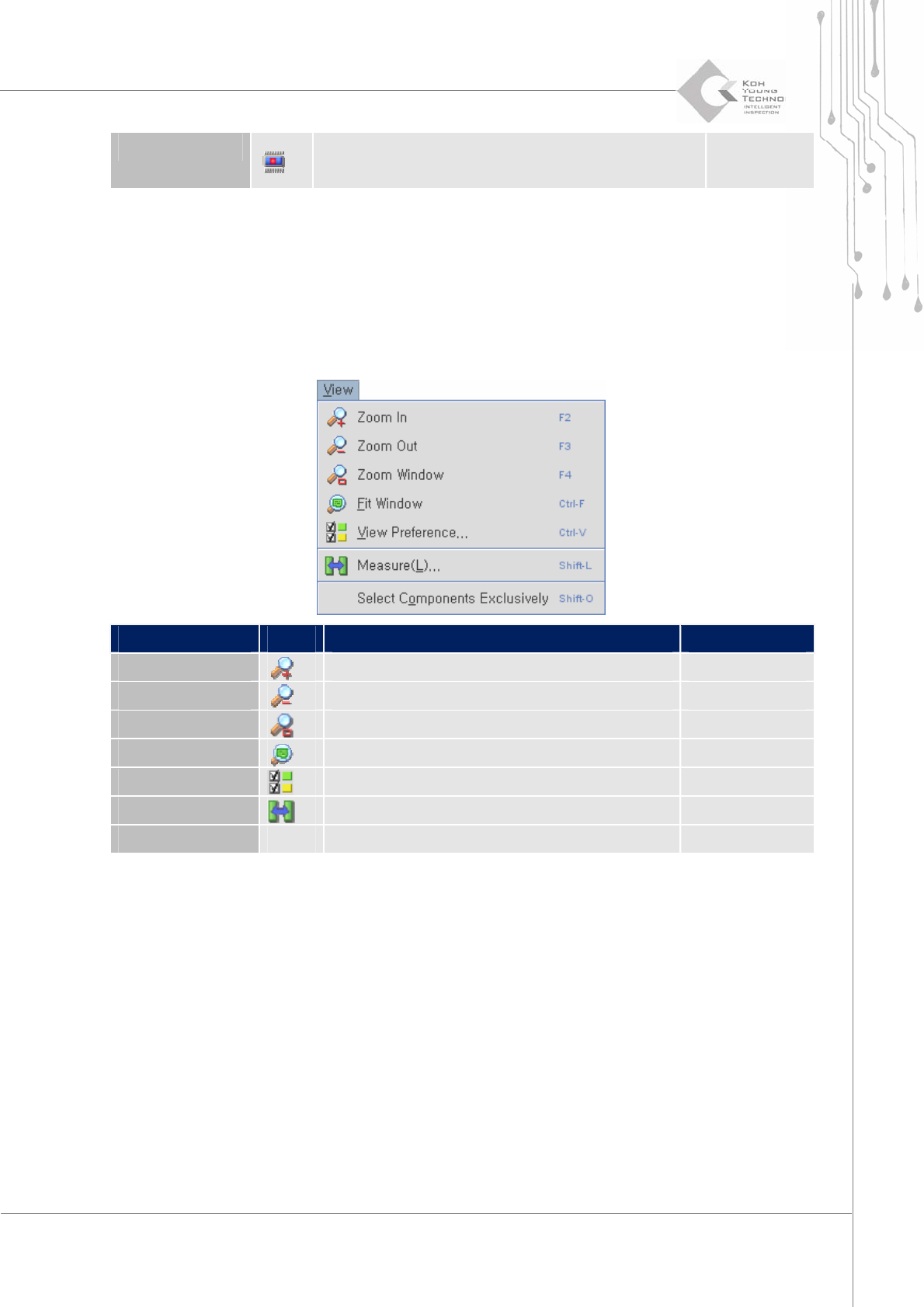 Programmer ’ s Manual | 23 Move Comp. Center 移動元件中心點位置 Shift+S 3.1.3. V IEW M ENU 瀏覽選單 主要功能: ¾ 放大, 縮小, 選擇性瀏覽物件, 量測顯示的物件 Menu Icon Information Short Key Zoom In 放大工作範圍至可視範圍 F2, Z Zoom Out 縮小工作範圍至可視範圍 F3, X Zoom Window 選擇性…