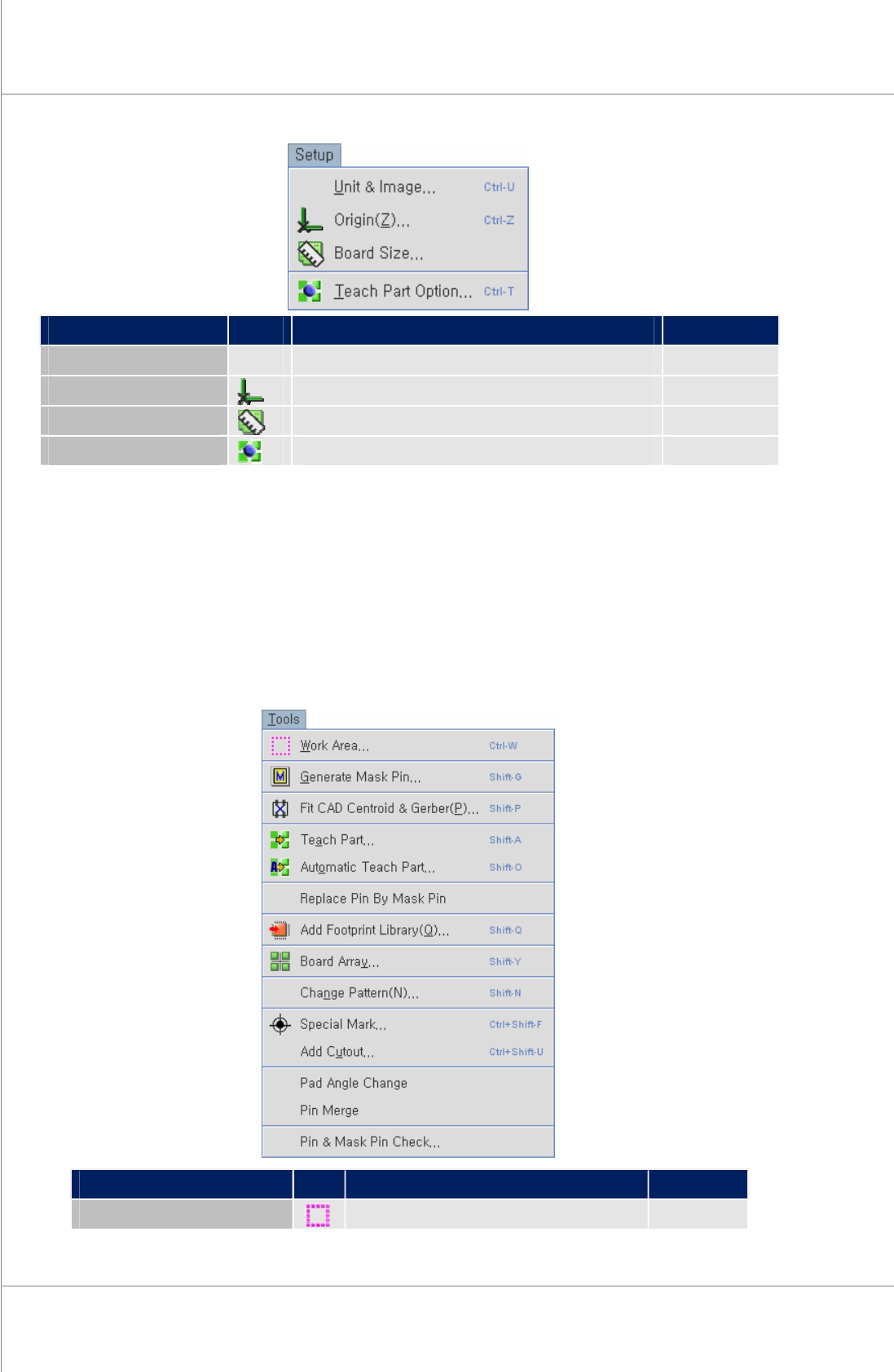 Programmer ’ s Manual | 25 Generate Mask Pin 產生 Mask Pin Shift+G Fit CAD Centroid & Gerber 辨識Gerber 與 CAD X-Y 整合後原點位置 Shift+P Teach Part 教導元件 Shift+A Automatic Teach Part 自動元件教導 功能 Shift+O Replace Pin By Mask Pin 修改E…