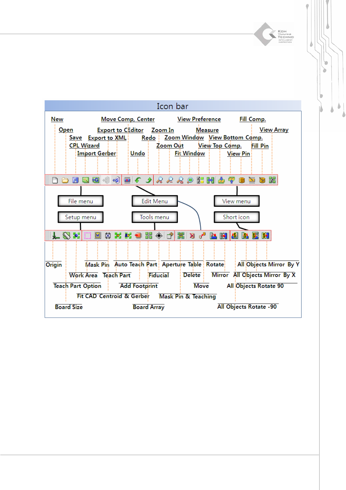 28 | Chapter 2. ePM-SPI TM 3D Solder Paste Inspec tion System V ersion 1.0 K OH Y OUNG T ECHNOLOGY . I NC . 3.3. Title Tab & Sub Items 標題按鍵與附屬項目 提供使用者更簡便的操作模式. Title Description Part 顯示元件清單 Layer 顯示Gerber 圖…