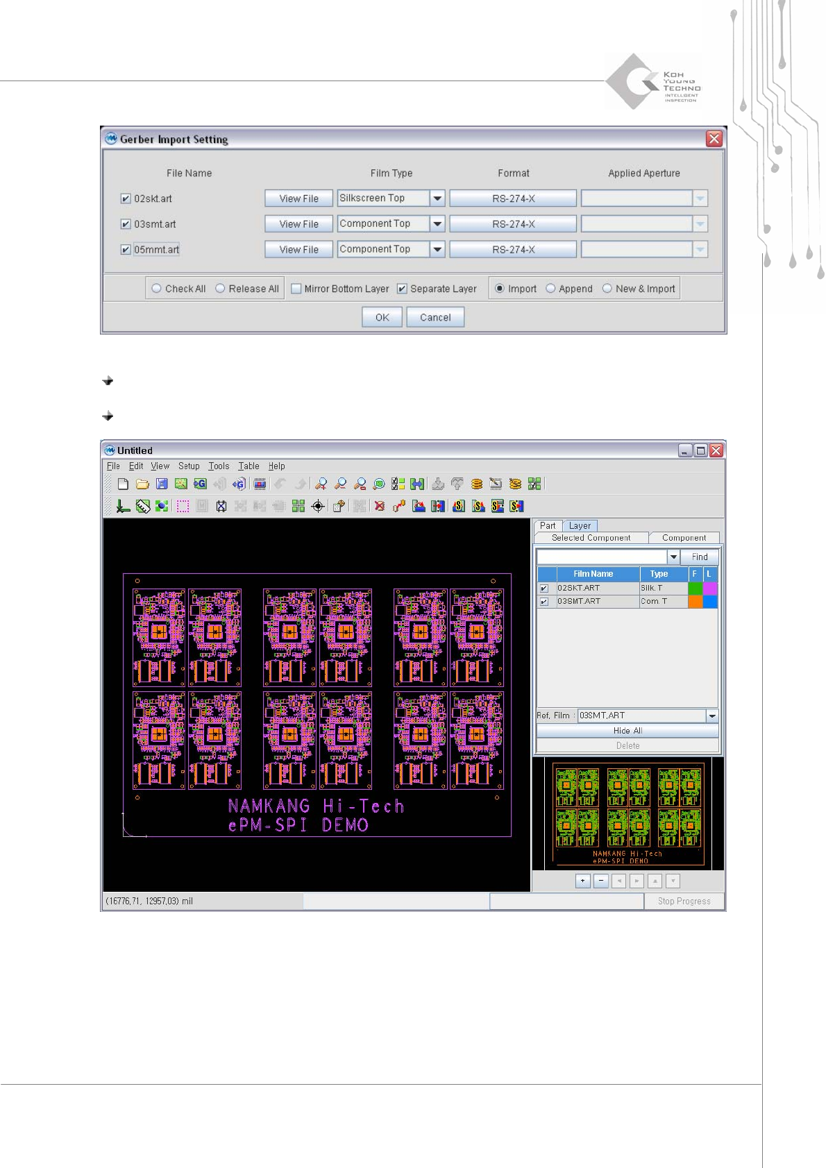 36 | Chapter 2. ePM-SPI TM 3D Solder Paste Inspec tion System V ersion 1.0 K OH Y OUNG T ECHNOLOGY . I NC . 4.1. Type A 4.1.1. 輸入G ERBER 步驟 1: 在選單中進入“Select Gerber Folder or Files" 點選 “Gerber". 步驟 2: 選擇Gerber f…