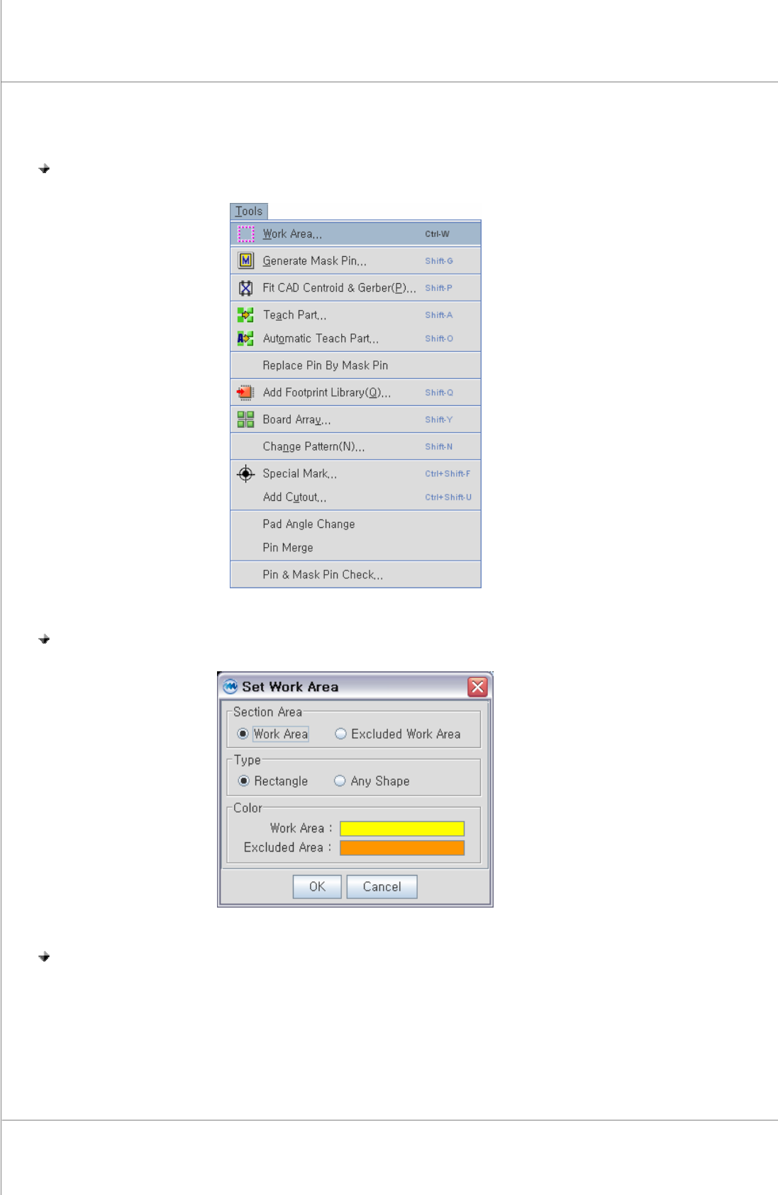 48 | Chapter 2. ePM-SPI TM 3D Solder Paste Inspec tion System V ersion 1.0 K OH Y OUNG T ECHNOLOGY . I NC . 4.2.5. 工作區域 步驟 1: 在“Tools" 選單中點選 “Work Area". 步驟 2: 以滑鼠圈選基板範圍. 步驟 3: 在“Set Area" 選單中按下 “OK" .