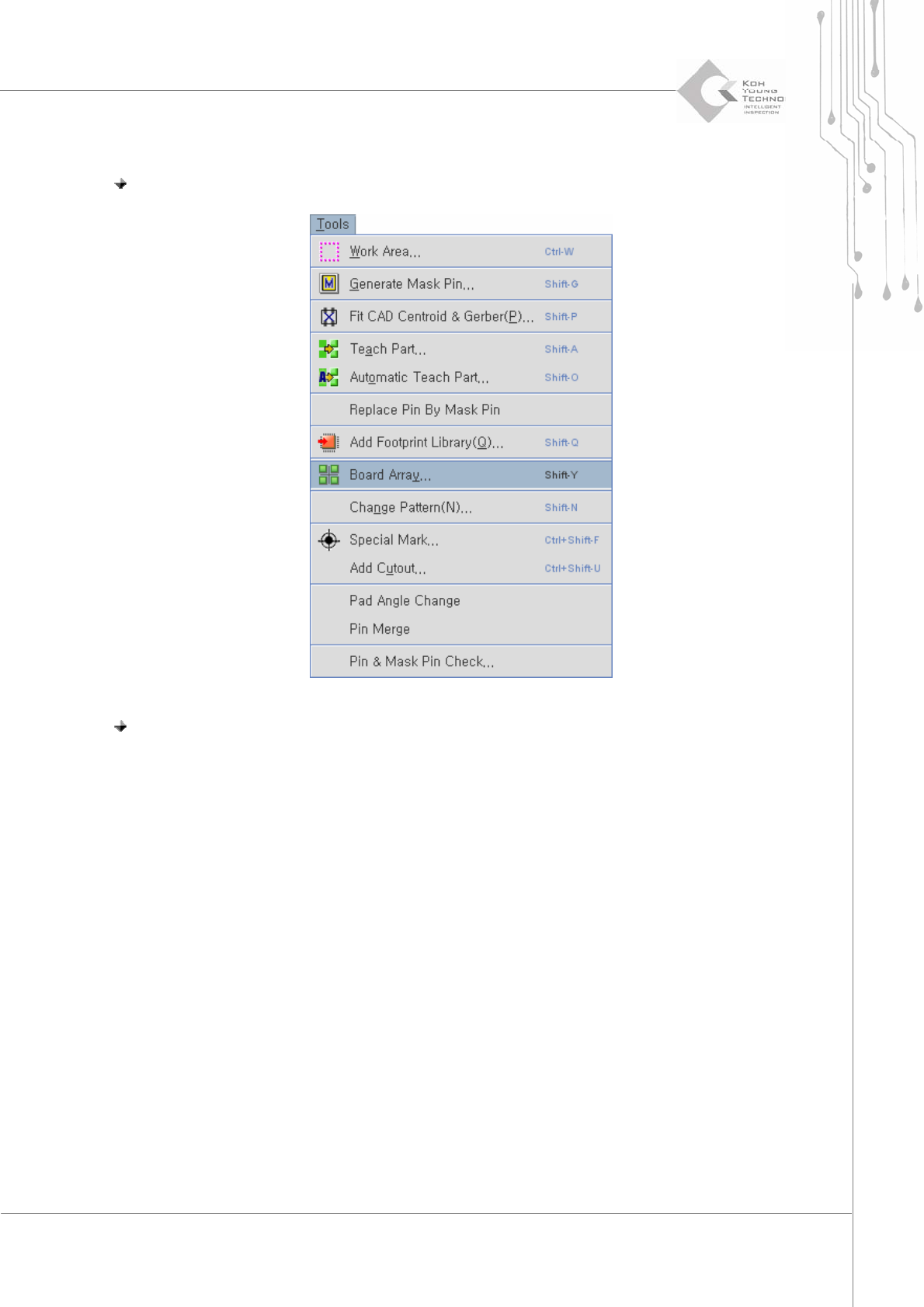 52 | Chapter 2. ePM-SPI TM 3D Solder Paste Inspec tion System V ersion 1.0 K OH Y OUNG T ECHNOLOGY . I NC . 步驟 3: 使用滑鼠選取PCB中可辨識的區塊. 步驟 4: 選擇連板數量.