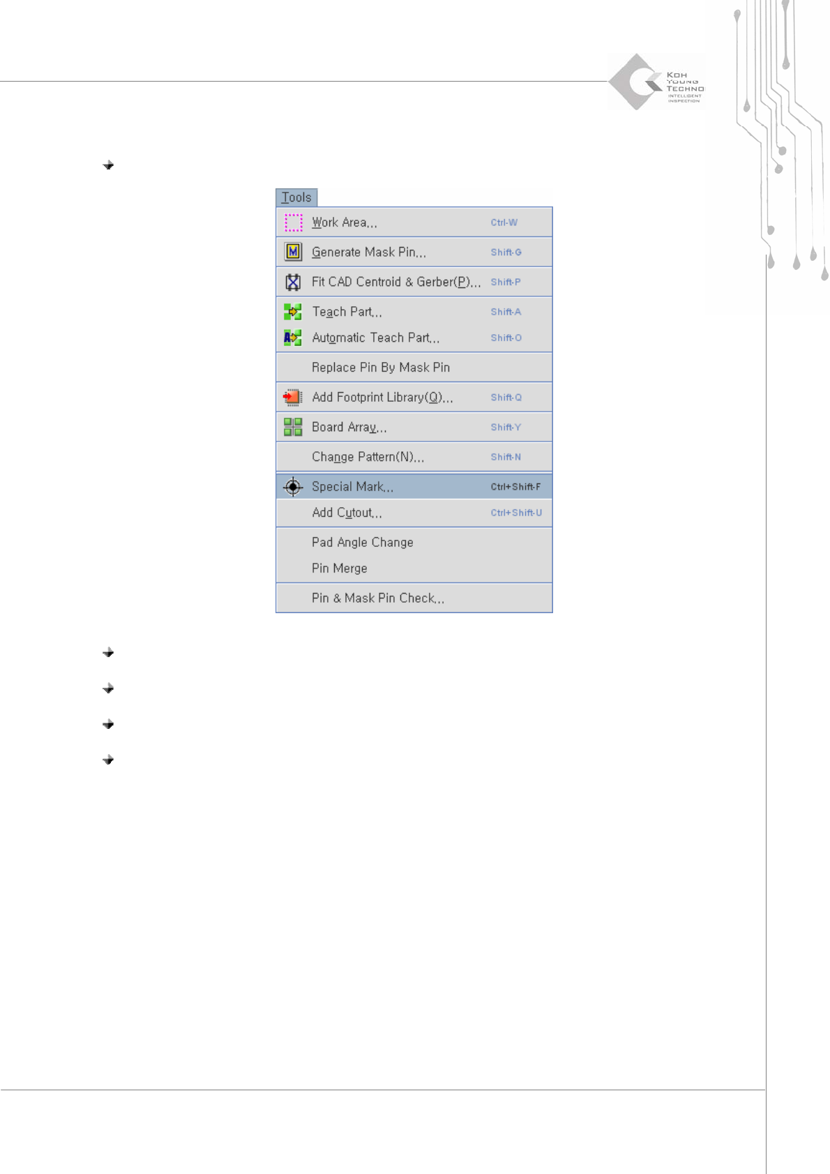 Programmer ’ s Manual | 71 4.3.11. 定位點(選配) 步驟 1: 在“Tools"選單中點選 “Special Mark". 步驟 2: 在“Generate Special Mark"選單中選擇“Mark Type"型式. 步驟 3: 在“Generate Special Mark" 選單中選擇“M ark Region" 型式. 步驟 4: 圈選Gerber 物件. 步驟 5: 在“Generate …