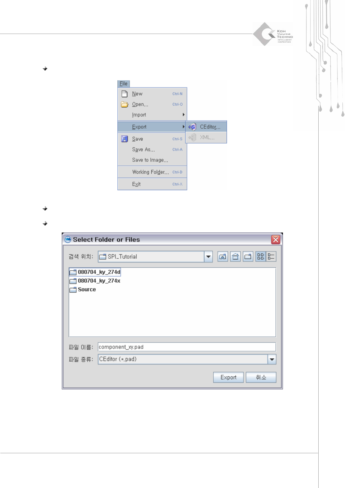 Programmer ’ s Manual | 73 4.3.12. E XPORT 步驟 1: 在“File"選單中點選“CEditor". 步驟 2: 輸入檔案名稱. 步驟 3: 在“Select Folders o r Files"選單中點選“Export". 當完成步驟3後, CEditor 程式將會顯示在螢幕當中.