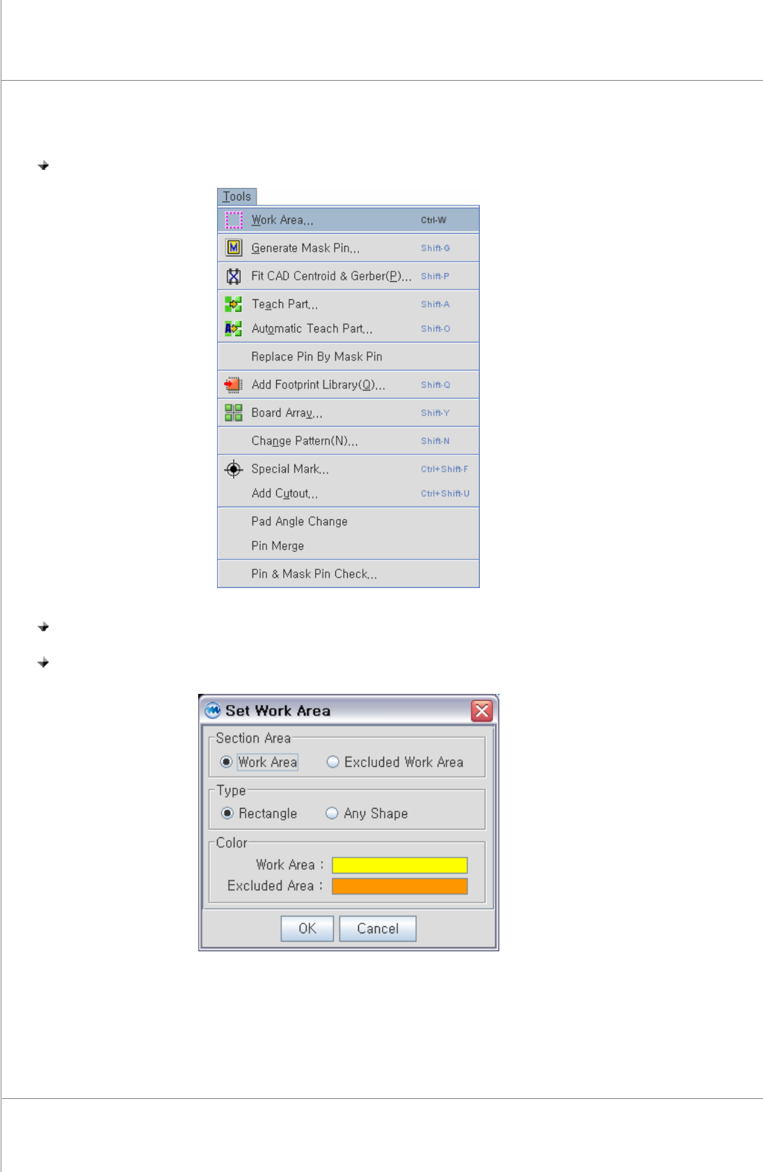 82 | Chapter 2. ePM-SPI TM 3D Solder Paste Inspec tion System V ersion 1.0 K OH Y OUNG T ECHNOLOGY . I NC . 4.4.7. 工作區域 步驟 1: 在“Tools" 選單中點選 “Work Area" 步驟 2: 以滑鼠圈選基板範圍. 步驟 3: 在“Set Area" 選單中按下 “OK".