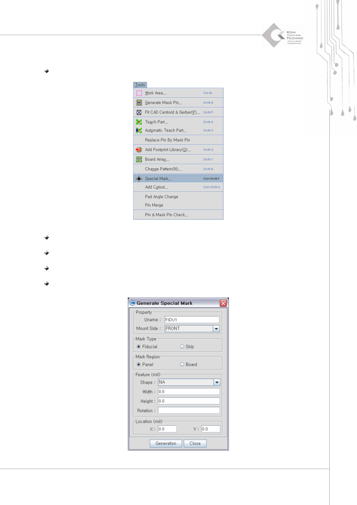 86 | Chapter 2. ePM-SPI TM 3D Solder Paste Inspec tion System V ersion 1.0 K OH Y OUNG T ECHNOLOGY . I NC . 步驟 3: 使用滑鼠選取PCB中可辨識的區塊 步驟 4: 選擇連版數量.