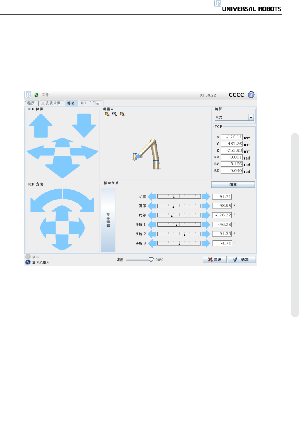 在此屏幕,始终可通过平移/旋转机器人工具或逐个移动机器人关节来直接移动( 缓慢移动) 机