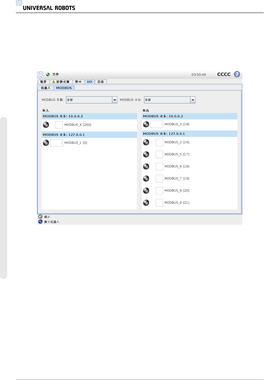 在此屏幕上,您可以始终监控并设置机器人控制箱收发的实时 I/O 信号。屏幕将显示 I/O 的当