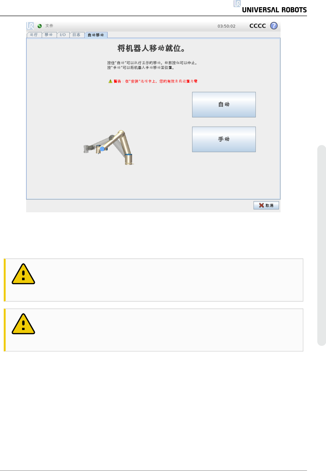 自动移动功能使机器人沿着阴影区轨迹移动。碰撞可能会损坏机器人或其他设