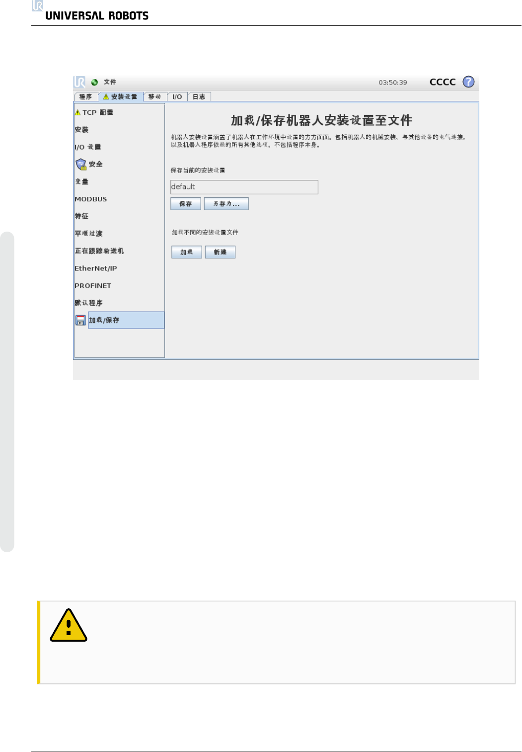 按钮可加载其他安装设置文件。新建按钮可将机器人安装设置中的所有设置重置为出厂默认