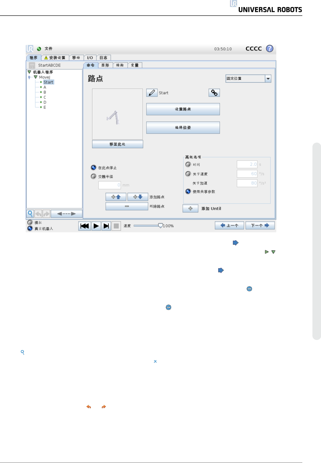 果机器人手臂正在朝着某个路点移动,则相应的路点子命令将使用 图标标记,其名称以及