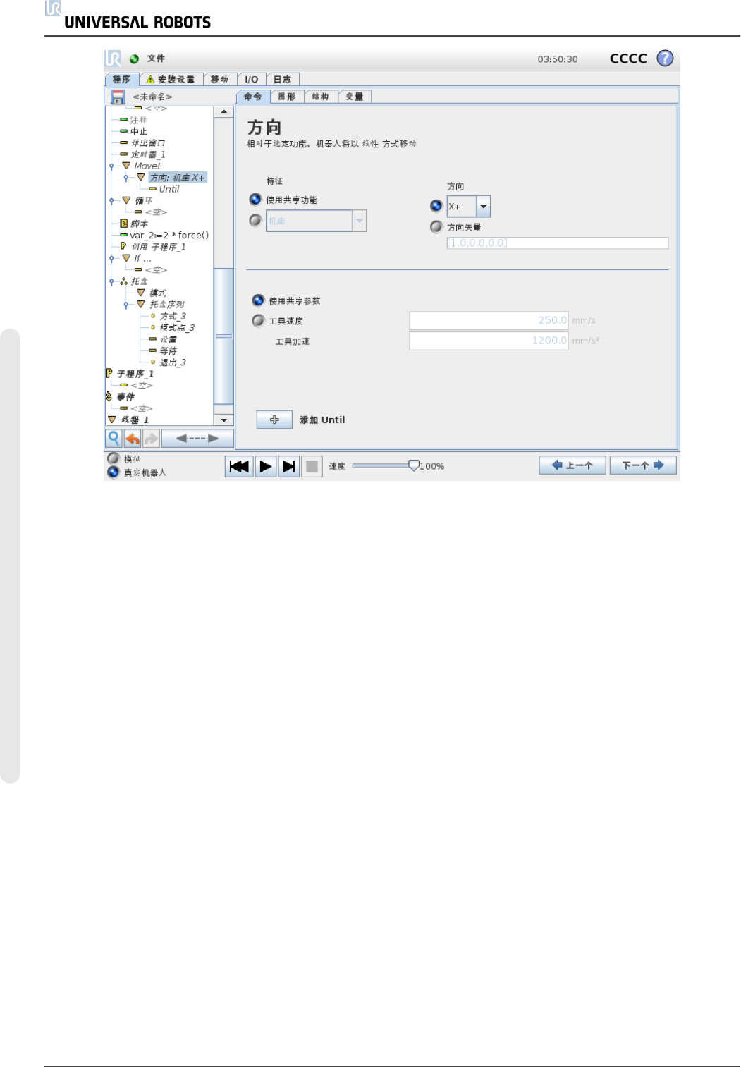 程序节点 Until 定义运动的停止条件。机器人沿着路径移动并在检测到接触时停止。