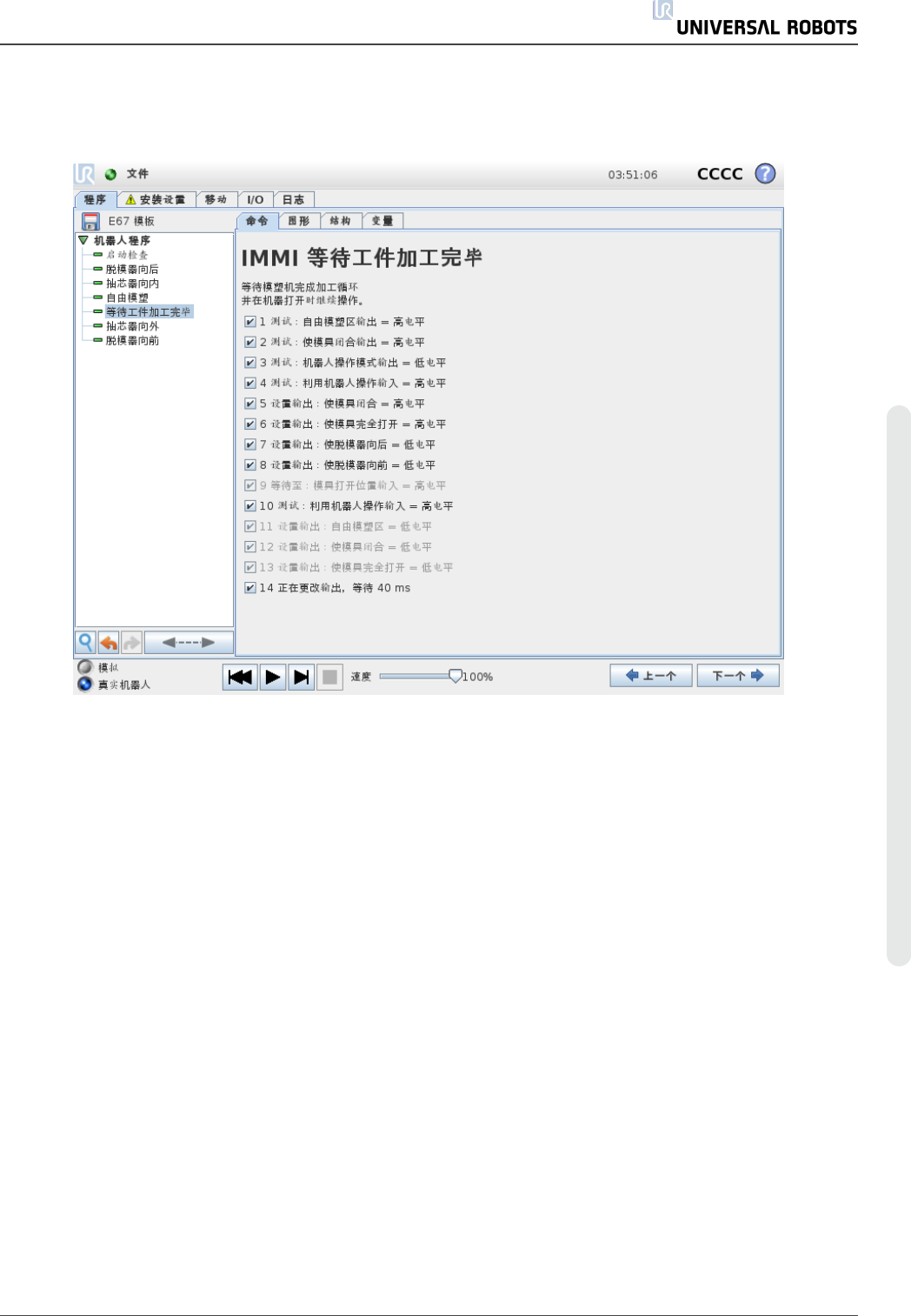 用于让机器人等待 IMM 中的工件注塑就绪。使用复选框可启用/禁用各个步骤。