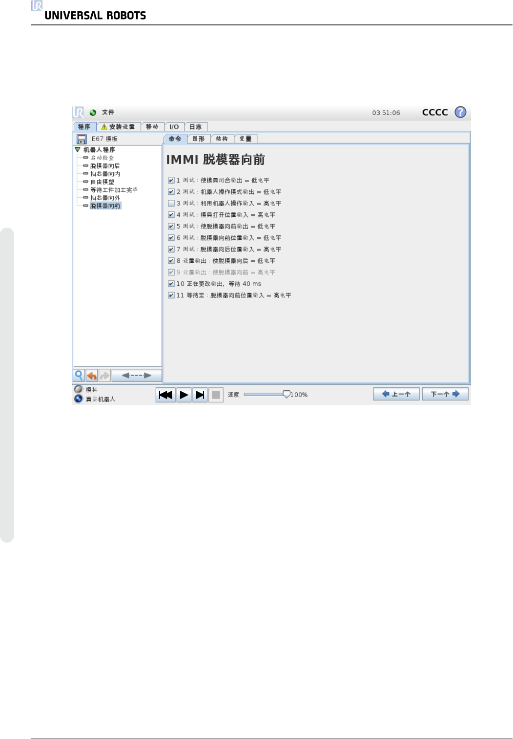 脱 模 器 向 前 使 脱 模 器 移 动 , 以 从 模 具 中 搬 运 出 工 件 。 使 用 时 机 器 人 的 位 置 应 已 准 备 就 绪 , 可 以 抓 取 工 件 。 使 用 复 选 框 可 启 用 / 禁 用 各 个 步 骤 。 U R5 2 12 用 户 手 册 EU ROMAP 6 7 I n ter face 版 权 所 有 © 2 009–2021U ni ver s al R obots A/S 。 保…