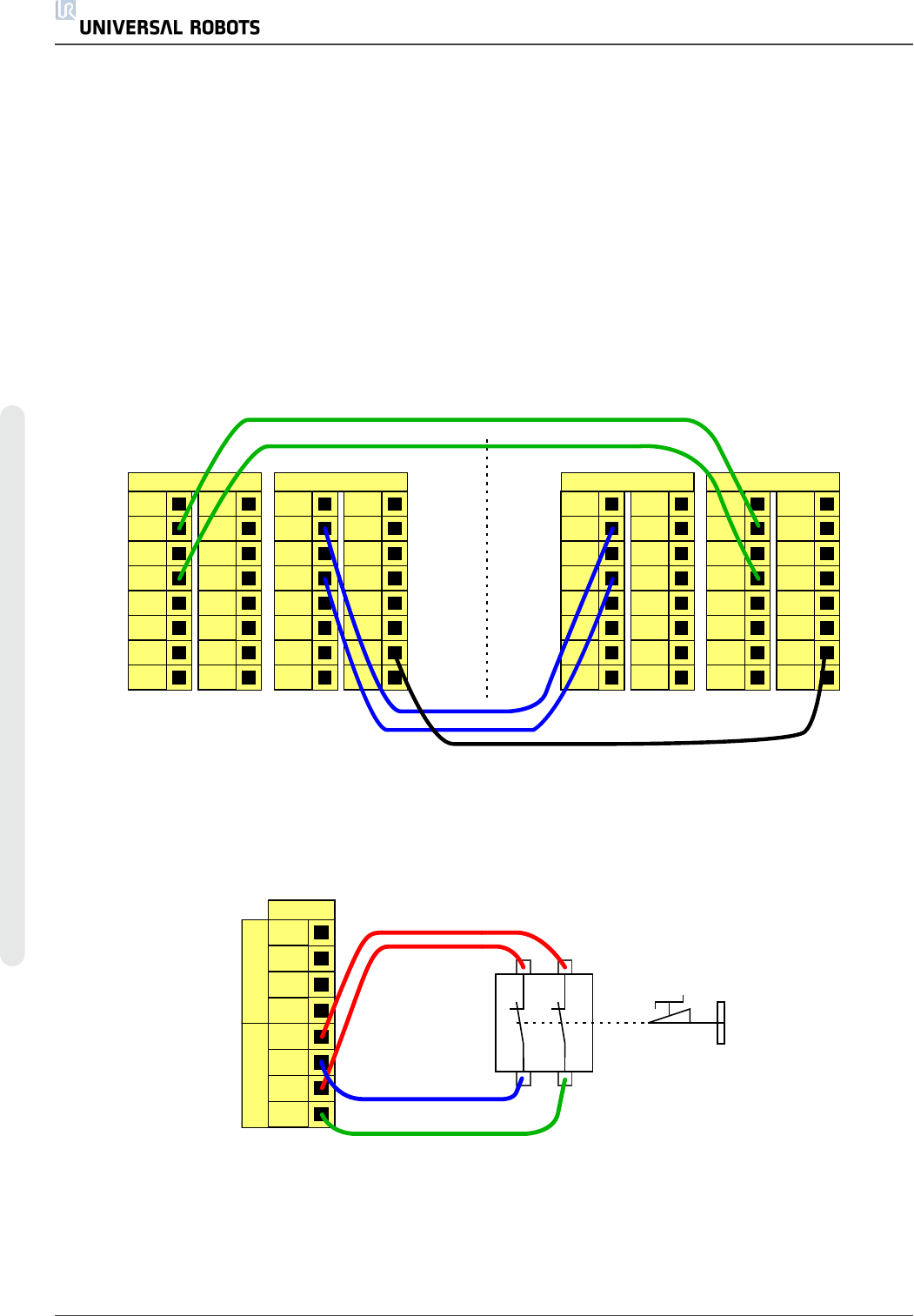 下图显示了 UR 机器人如何共享紧急停止功能。在本例中,使用的配置 I/O 为“CI0-CI1”和“CO0-