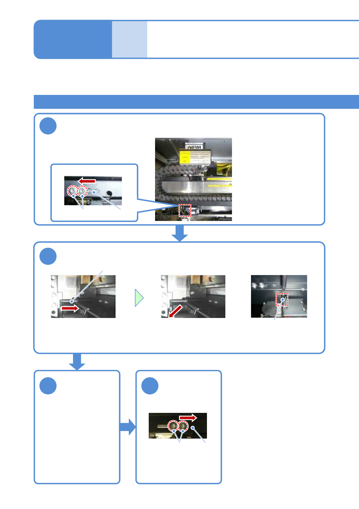 NPM- TT2 EJM1EC-MB-11 M-01 11 - 1 -7 维修保养篇 11 - 1 贴装头和吸嘴交换器的更换 4 1 2 3 4 旧型贴装头的安装 ( 固定螺栓的拆卸 ) 在 NPM-TT2 上安装旧型贴装头时,执行“贴装头的安装 ” ( → P.11-1 -3 ) 的步骤 4 之前,需要先拆卸下不使 用的 固定螺栓,并执行固定到设备内保管 位置上的作业。在下边对这 项作业的内容加以说明。 使用工具 : 六角扳手 (5m…
