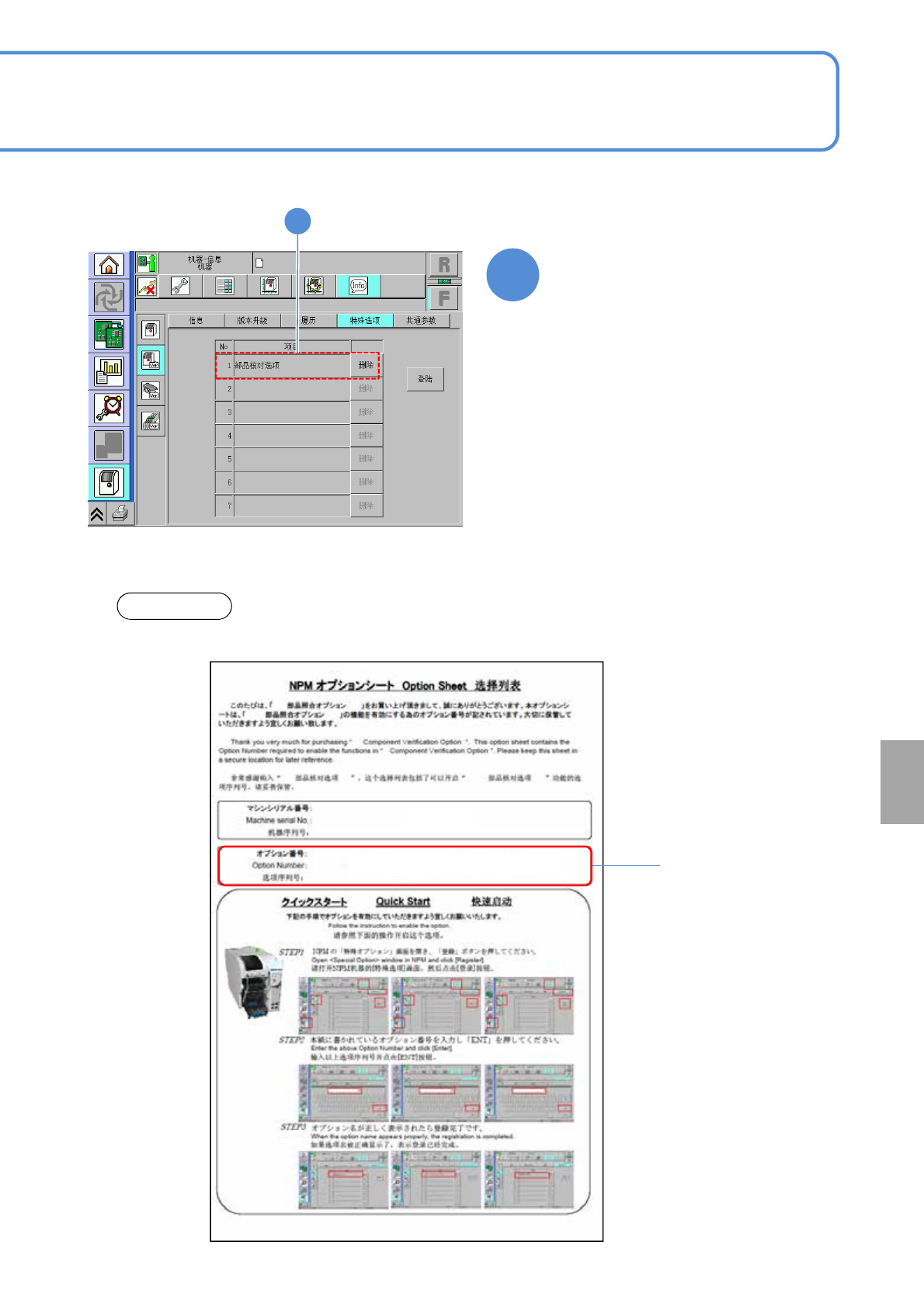 NPM- TT2 EJM1EC-MB-15 M-00 15-3 -1 维修保养篇 15-3 A 项目 1 登录选项许可 对选项许可的登录和删除方法进行说 明。 显示已登录在设备的选项许可。 A 1 确认提示 2 4 ( 显示登录后的选项 ) 显示是否使用有线扫描仪进行登录的 提示 ●使用有线扫描仪 : ●不使用有线扫描仪 : 2 ■使用有线扫描仪时 ●输入选项列表中记载的 “ 选项编号 ” 。 ●选项列表中记载的序号与设备上所贴 产品标…