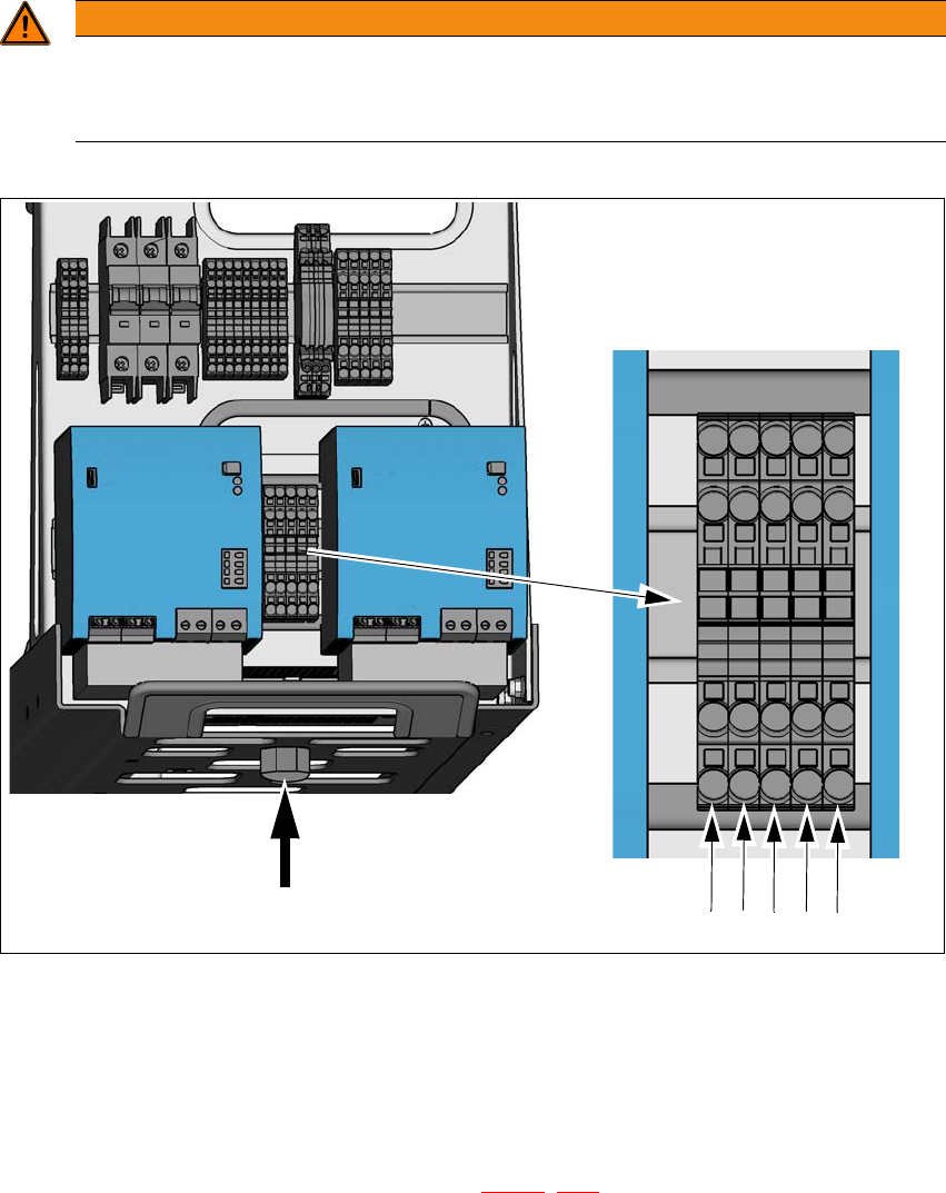 (1) 주전원 케이블 L1, L2, L2, N 및 PE 용 주전원 연결 단자 (X94). 이 연결 단자는 직경이 4mm²인