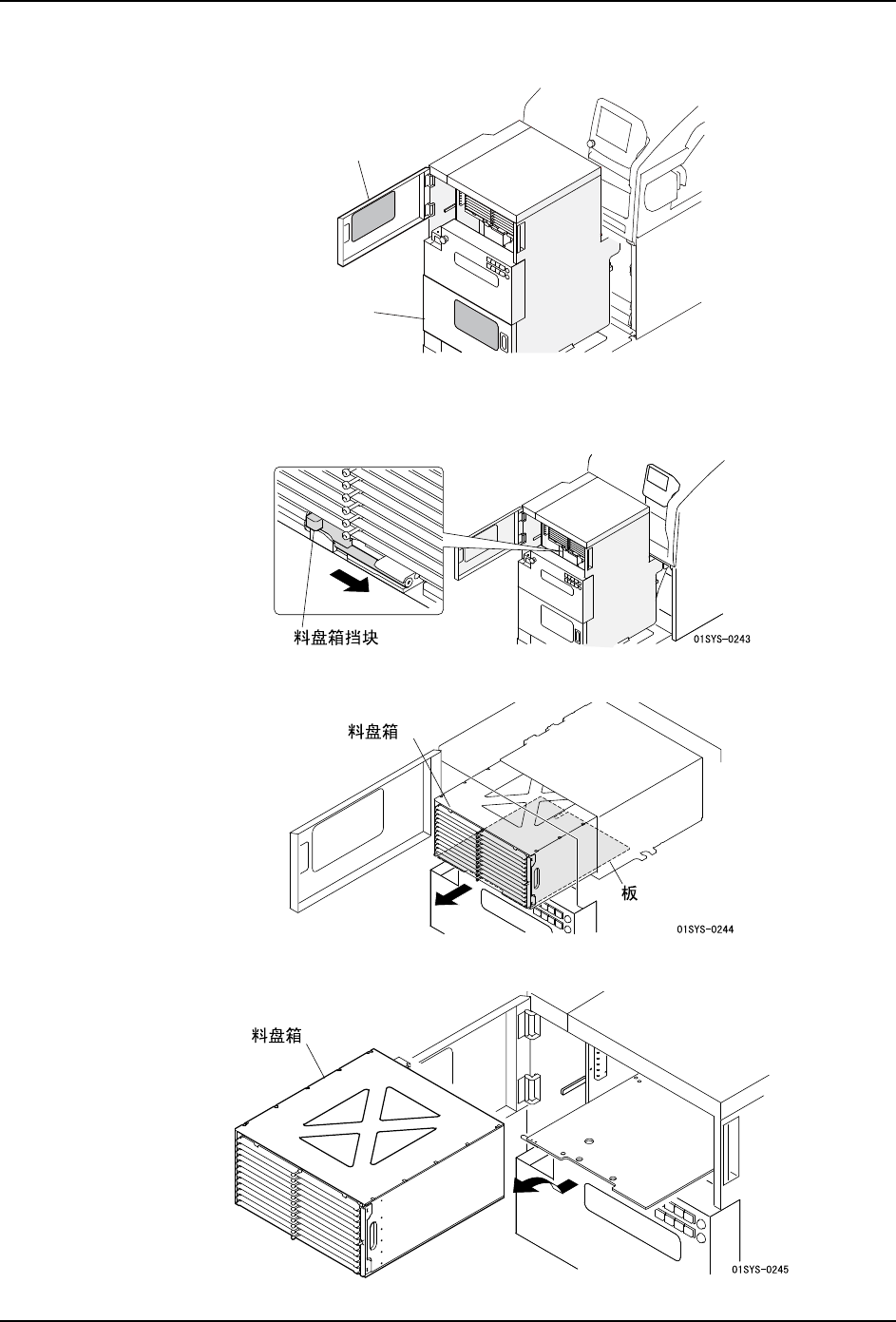b. 拉出载有料盘箱的板。请慢慢地拉出,直到锁定为止。