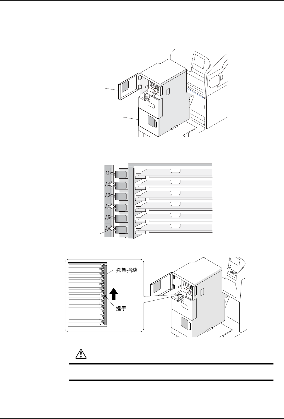 注意 )在将料盘托架安装到料盘箱内时,在不产生冲击下将料盘托架放入最里面。