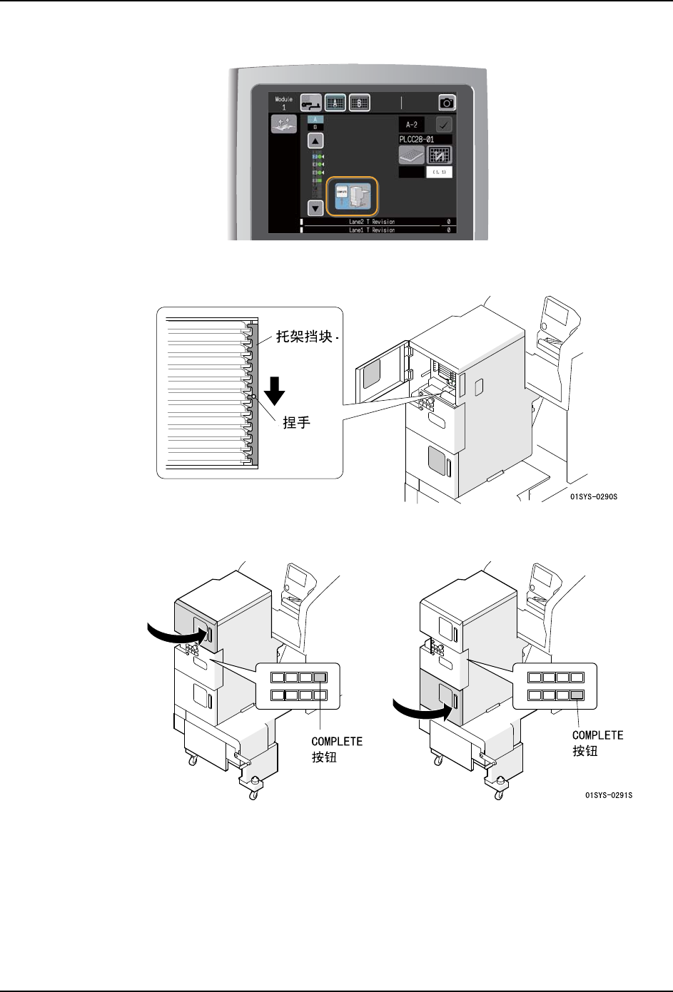 4. 生产准备 SYS-NXT3-002S0 92 NXT III 系统手册 6. 完成所有的补料后,就会显示 COM PLETE 按钮按下的向导画面。 7. 请拿住捏手,放下托架挡块。 8. 请关闭正 面门,按下 COM PLETE 按钮。 备注 )请轻轻关闭正面门,以免料盘装置 -LTC 受到冲击。 01SYS-0744