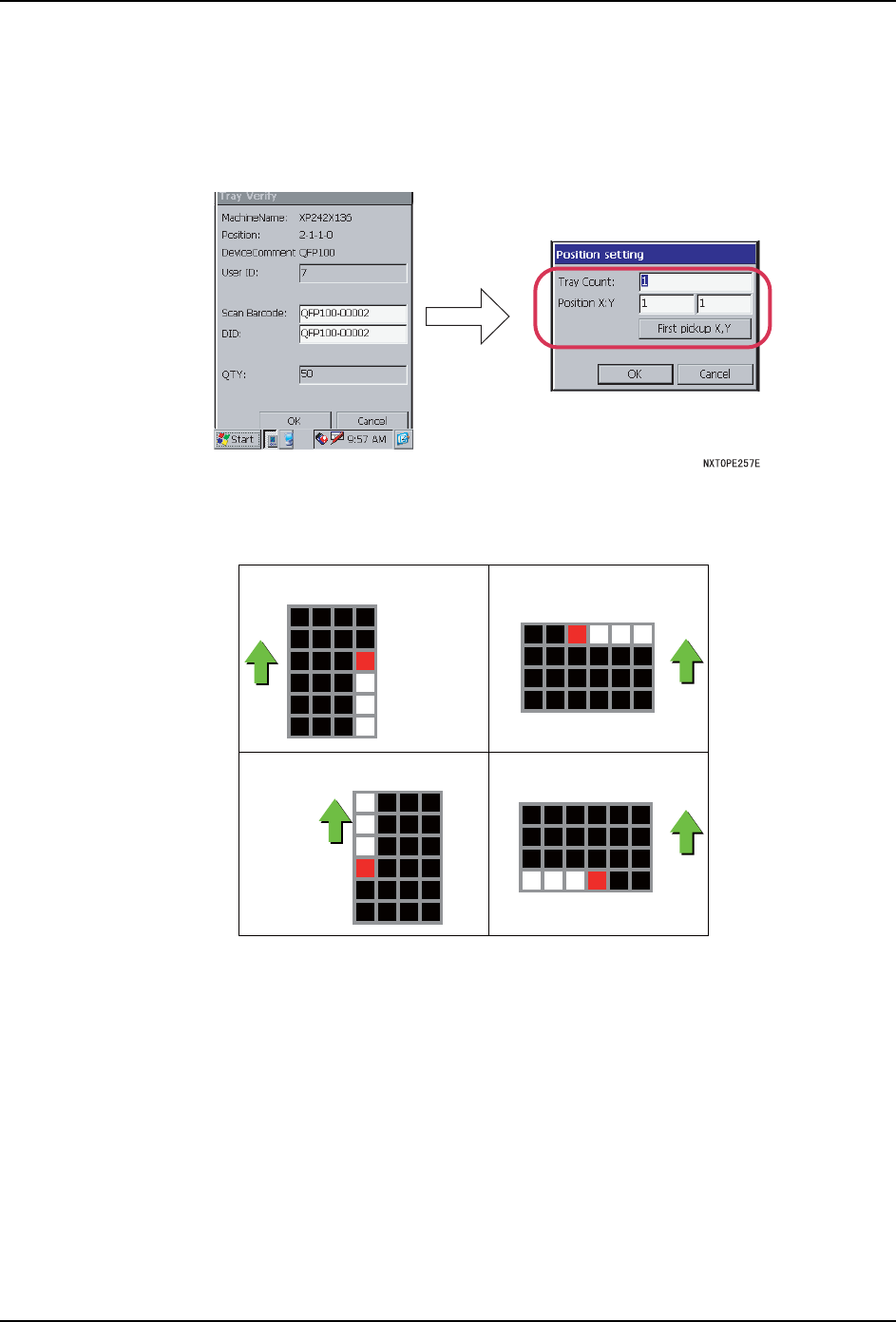 SYS- NXT3 -002S0 4. 生产准备 NXT III 系统手册 99 通过 KIT Handy 指定 请在 KIT Hand y 上进行以下的操作。 1. 请使用 KIT Handy 读取要安装的料 盘的条形码。 2. 请输入最初进行吸取的元件的 X,Y 坐标。 备注 )此时, 输入料盘以外或者不存在元件的坐标 ,料盘元件的吸 取点指定无效, 通过对话 框显示出无效的通知。 备注 )即使是相同的料盘,根据供应方向,进行指定的…