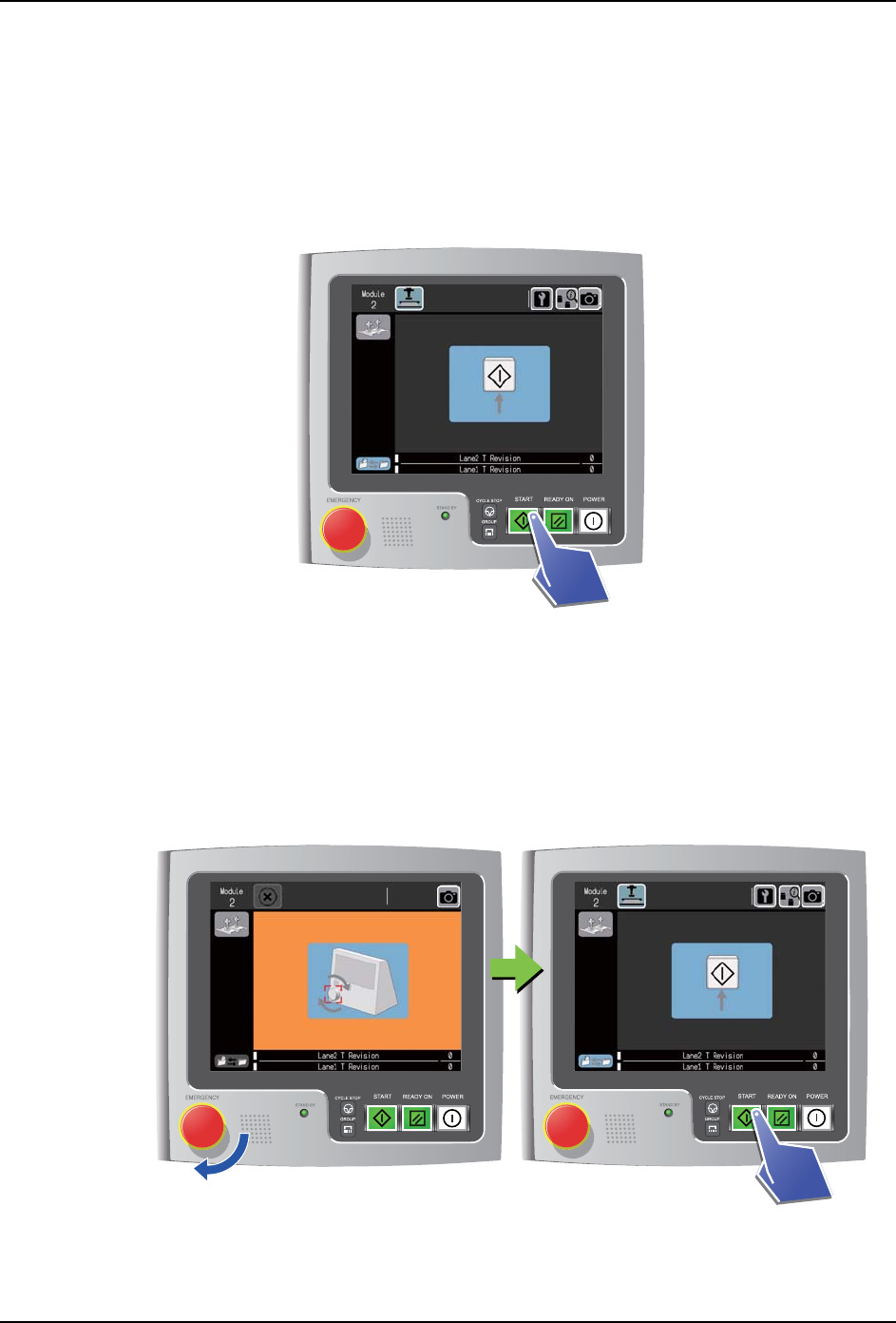 SYS- NXT3 -002S0 5. 生产 NXT III 系统手册 137 5.3 重新开始生产 5.3.1 从周期停止、电路板 送出后的停止状态重新开始生产 1. 处于周期停止状态及电路板 送出后的停止状态时,显示 S TART 等待画面。重新开始生产 时,请按下 START 按钮。 从周期停止状态重新开始时,将 从下一生产顺序开始进行生产 。 从电路板送出后的停止状态重新开 始生产时,机器载入下一电路板然 后开始生产。 5.3.…