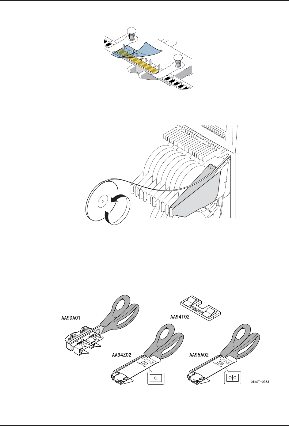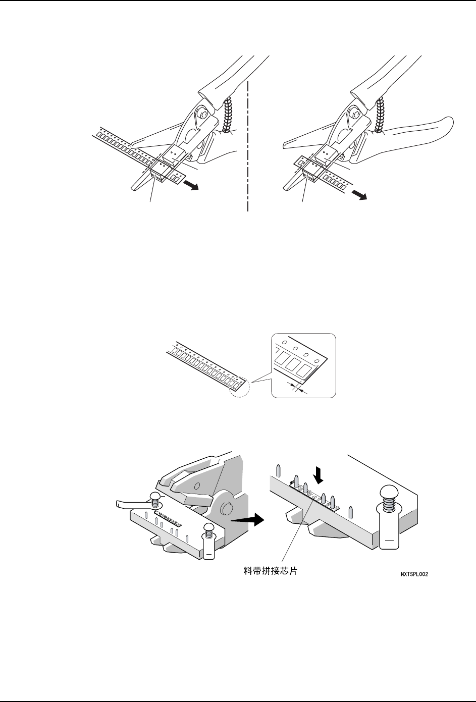4. 在新料带上的最初元件的前面与料带间距相吻合的适当位置处剪断料带。在剪断料带