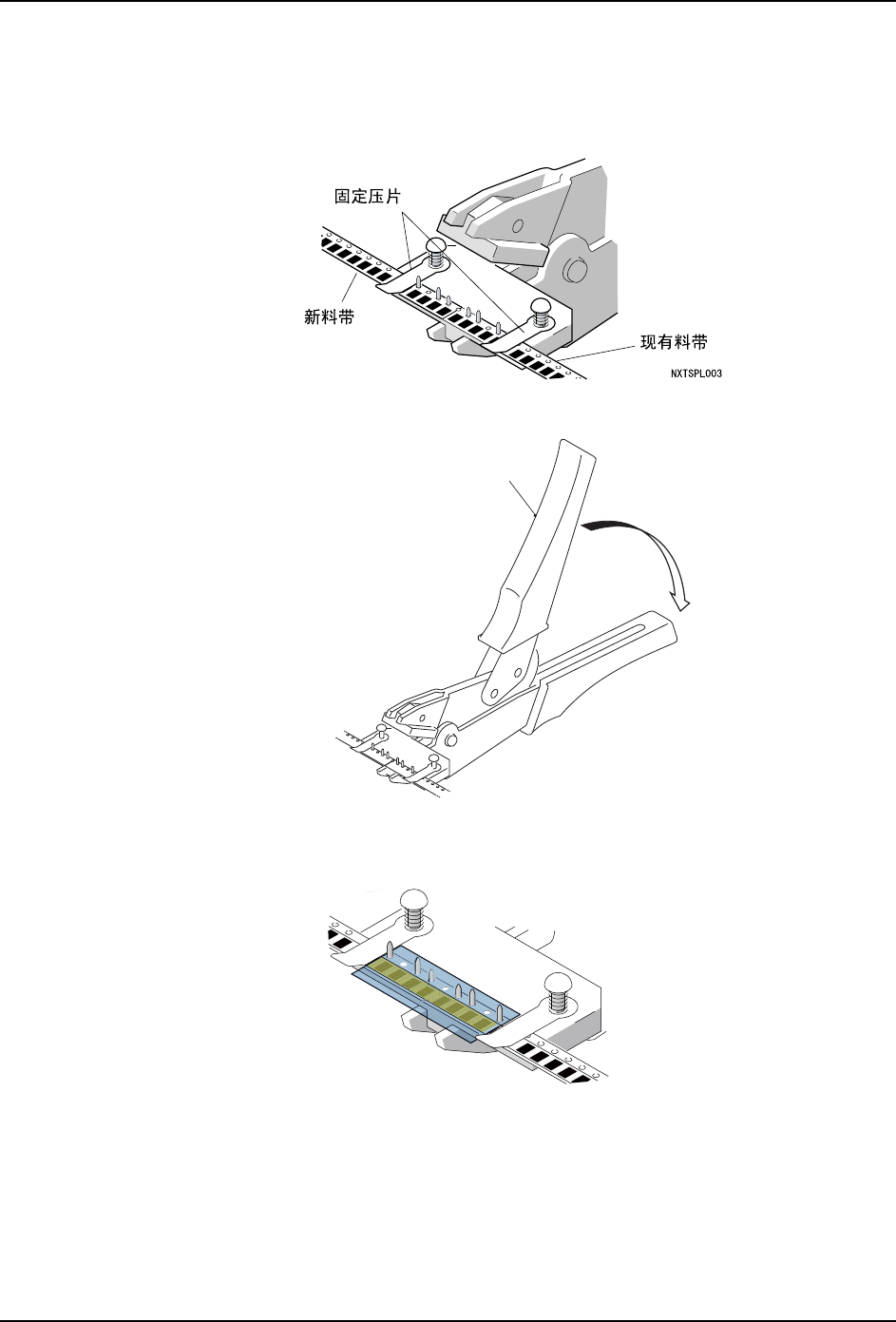 SYS- NXT3 -002S0 5. 生产 NXT III 系统手册 141 7. 在表面薄膜朝上的状态下,将新 旧料带放置在料带拼接工具上 。 a. 使旧料带的后端处在料带拼接芯片 的中央,然后用固定压片压住使料带 不产生偏移。 b. 使新料带的前端处在料带拼接芯片 的中央,然后用固定压片压住使料带 不产生偏移。 8. 用力握紧料带拼接工具的手柄,通 过料带拼接芯片连接双方的料带 。 备注 )握紧手柄时,请注意不要夹住手指或身体的其…