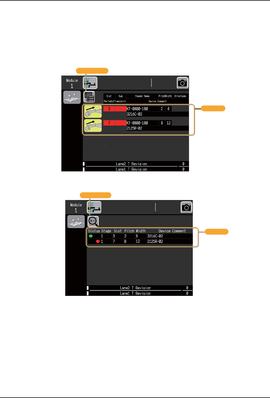 在 [ 列表显示 ] 画面上,能够知道安装供料器的位置。供料器数量多的时候,请滚动列表查