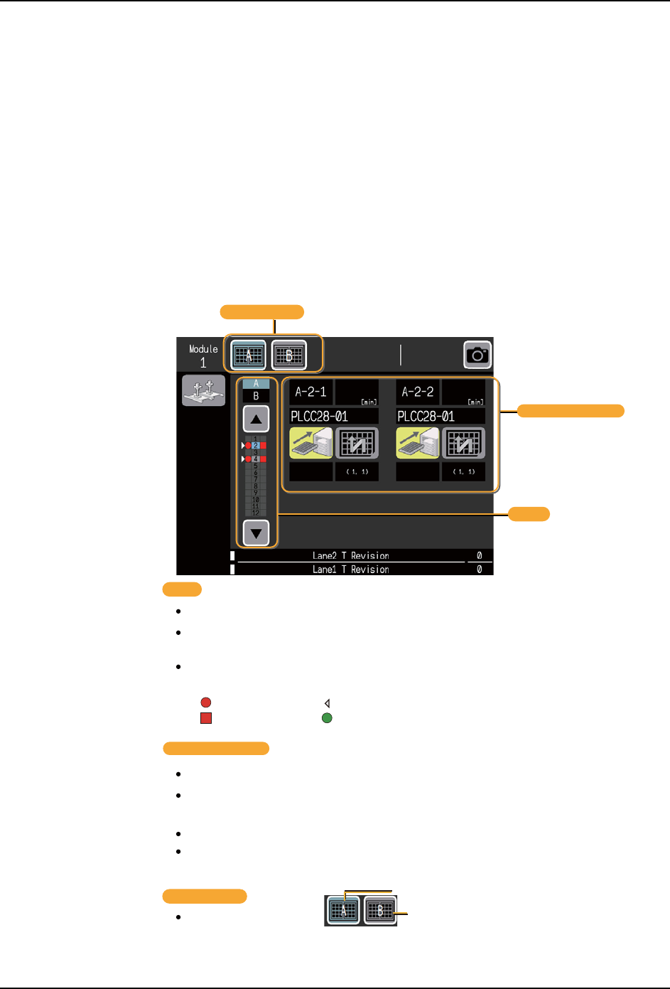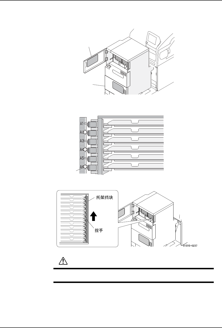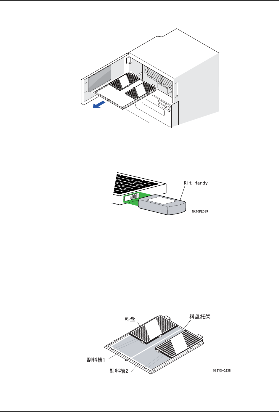5. 生产 SYS-NXT3-002S0 154 NXT III 系统手册 拉出托盘 1. 打开料盘装置 -LT 的正面门。正面门有 上下 2 扇。请打开要补料料盘一侧的门。 2. 请确认要补料的料槽。需要补料 的料槽的 LED 亮灯着。另外,对于向导画面 上所选择的 料槽,LED 闪烁着。 3. 请拿住捏手,抬起托架挡块。 备注 )即使在托架档块处于下降 状态时也可以半拉 出料盘托架。 此为便于操作员确认 元件状 态用的规格。补料时,…