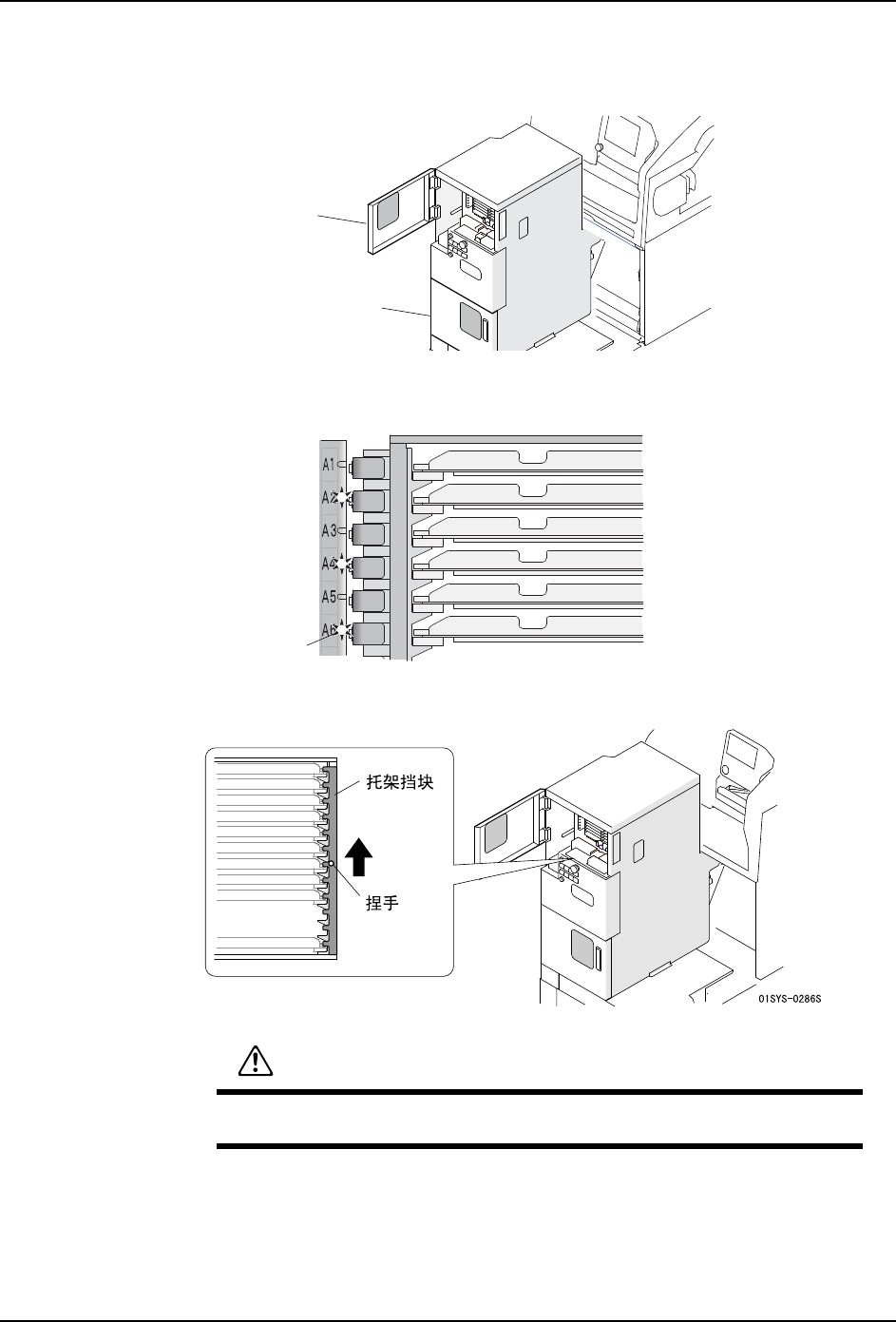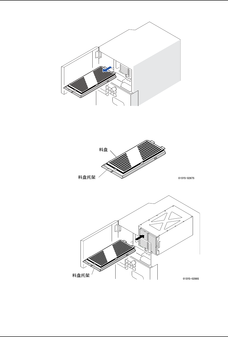 SYS- NXT3 -002S0 5. 生产 NXT III 系统手册 181 拉出托盘 1. 打开料盘装置 -LTC 的正面门。正面 门有上下 2 层。请打开要补料料盘一侧的门。 2. 请确认要补料的料槽。需要补料 的料槽的 LED 亮灯着。另外,对于向导画面 上所选择的 料槽,LED 闪烁着。 3. 请拿住捏手,抬起托架挡块。 备注 )即使在托架档块处于下降 状态时也可以半拉 出料盘托架。 此为便于操作员确认 元件状 态用的规格。补…