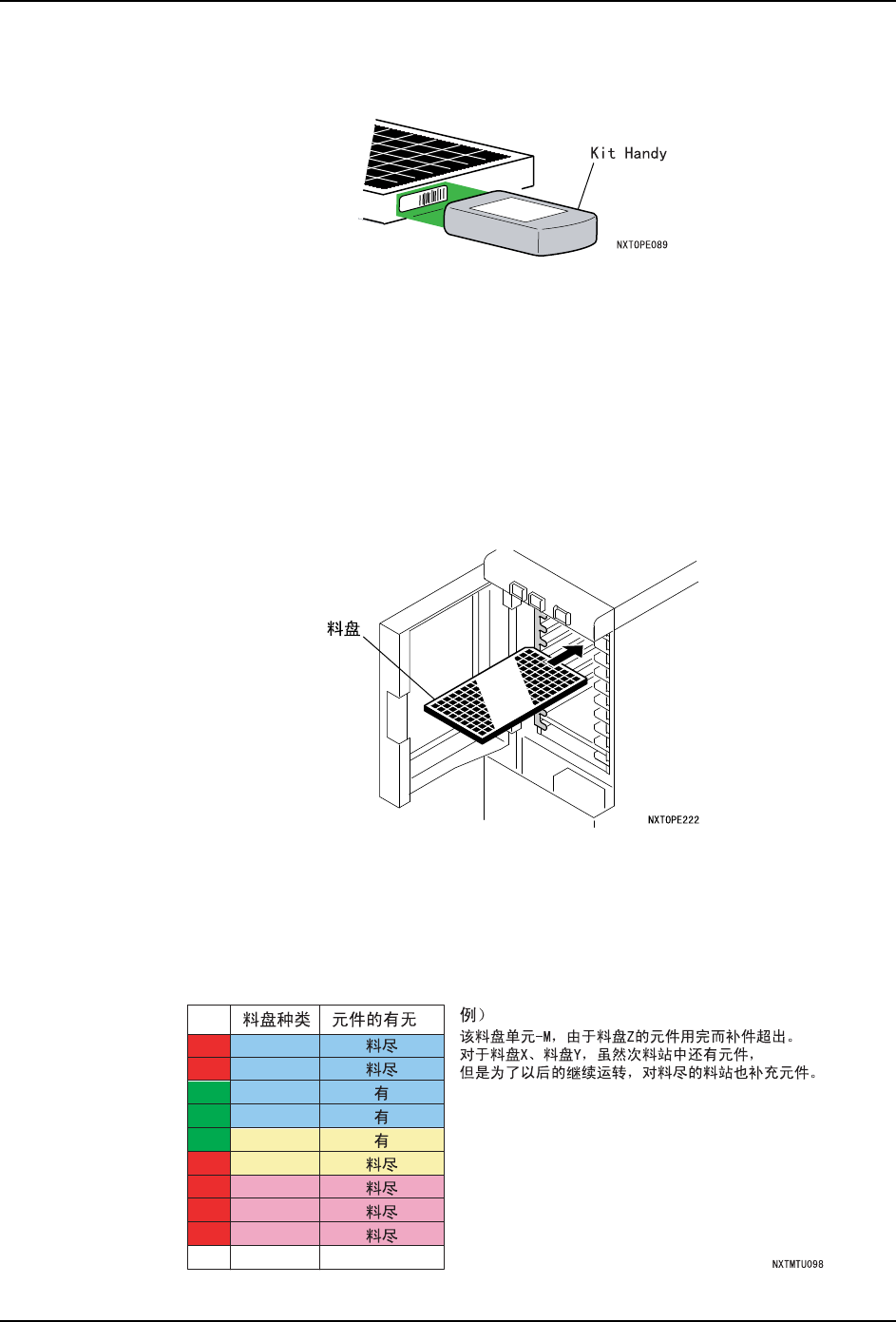 SYS- NXT3 -002S0 5. 生产 NXT III 系统手册 193 验证料盘元件 1. 请使用 KIT Manager 或 KIT Ha ndy 进行料盘验 证。 a. 在 KIT Handy 画 面或 KIT Manage r 画面上选择要 补料的料槽。 b. 使用 KIT Handy 或手 持式扫描器扫描 元件条形码或 D ID。 备注 )关于料盘的验证检查, 请参照 [Fujitrax Verifier 用户手册 ] …
