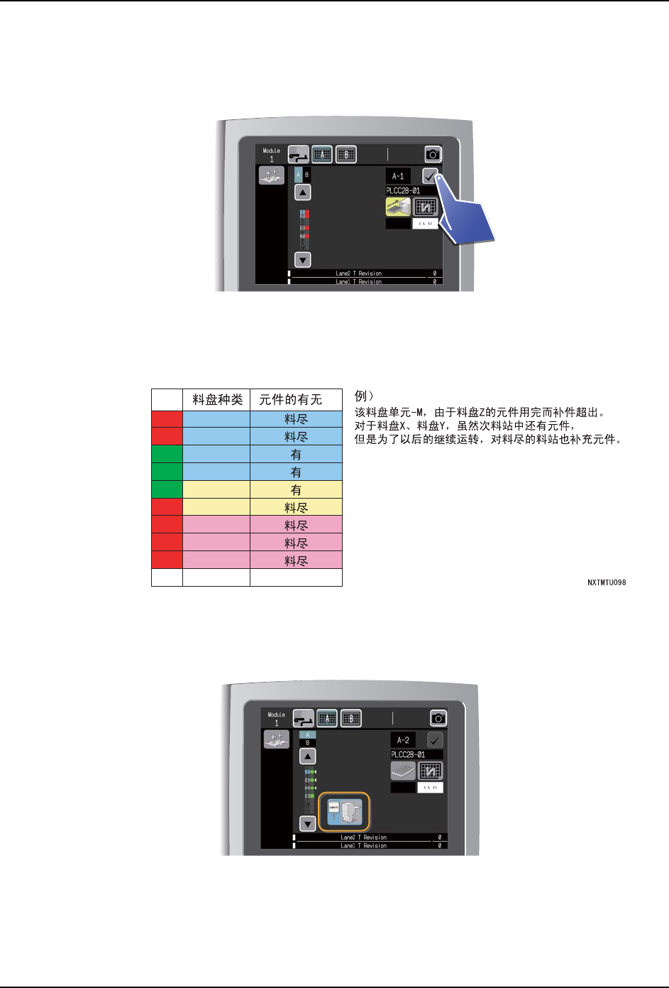 SYS- NXT3 -002S0 5. 生产 NXT III 系统手册 197 2. 如果需要指定料盘元件的吸取开始 点时,请在这里设定。请参照 "4.8.3 指定料盘元件 的吸取开始点 "。 3. 请选择已补料料槽的状态下,按下 料盘安装按钮。 4. 如果有其他料槽的料盘更换的向导 ,请重复此前的作业。 a. 此时,不仅是出现停止原因的料槽 ,对于其他的料槽,如果料尽 ,也请安装新的料 盘。 b. 对于料尽的料槽,…