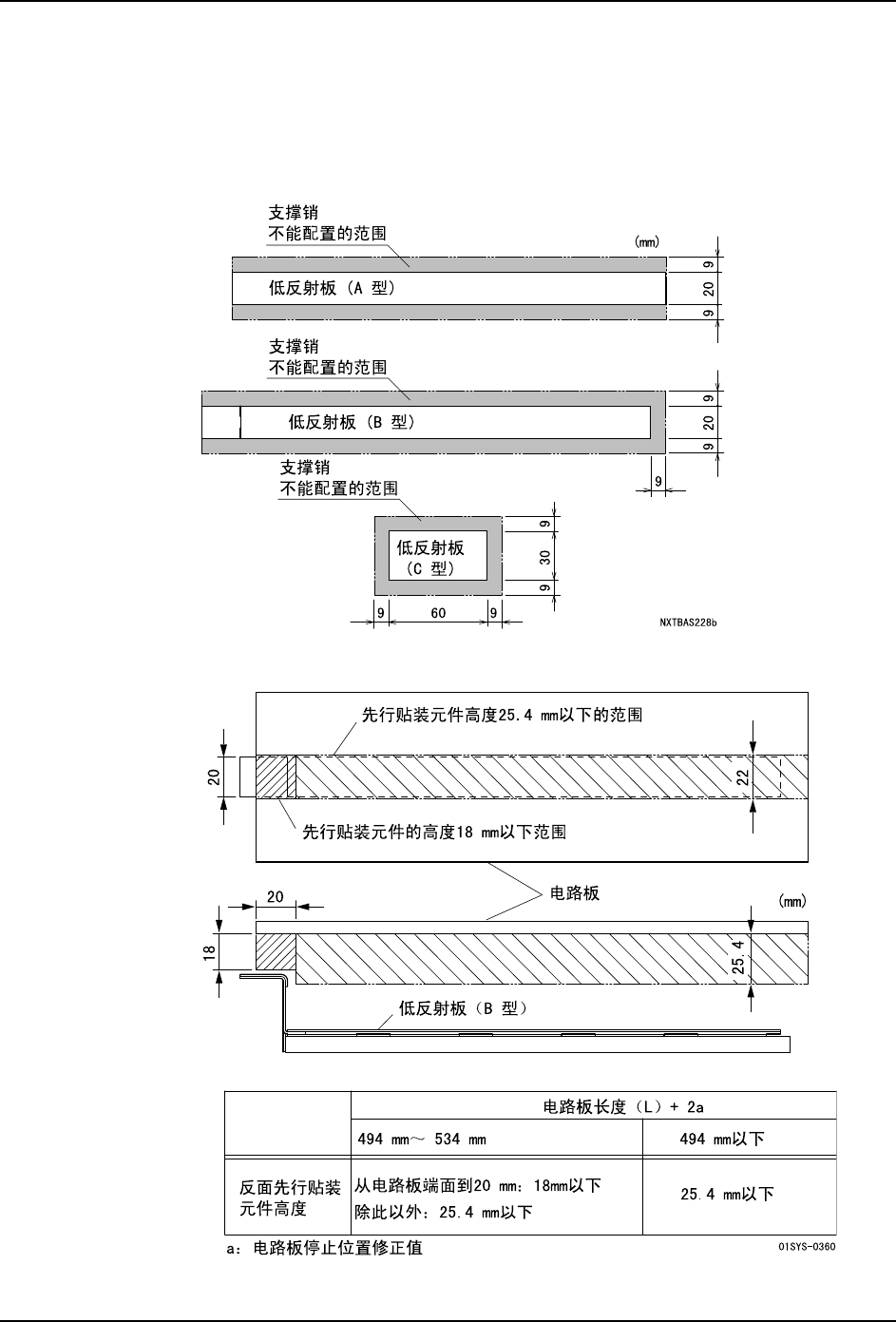 SYS- NXT3 -002S0 6. 运用各种功能时的操作 NXT III 系统手册 215 6.5.3 注意事项 1. 在电路板轮廓的检测区域内请不要 放置光泽物。 2. 如果支撑板上面附着了润滑剂等, 就会成为电路板轮廓检测失败的原因 。 3. 安装了低反射板后,在其周围不能 配置支撑销。不能配置的范围如下 。 4. 安装了 B 类型的低反射板的位置,对优先贴装元件的高 度有限制。请参考下图。