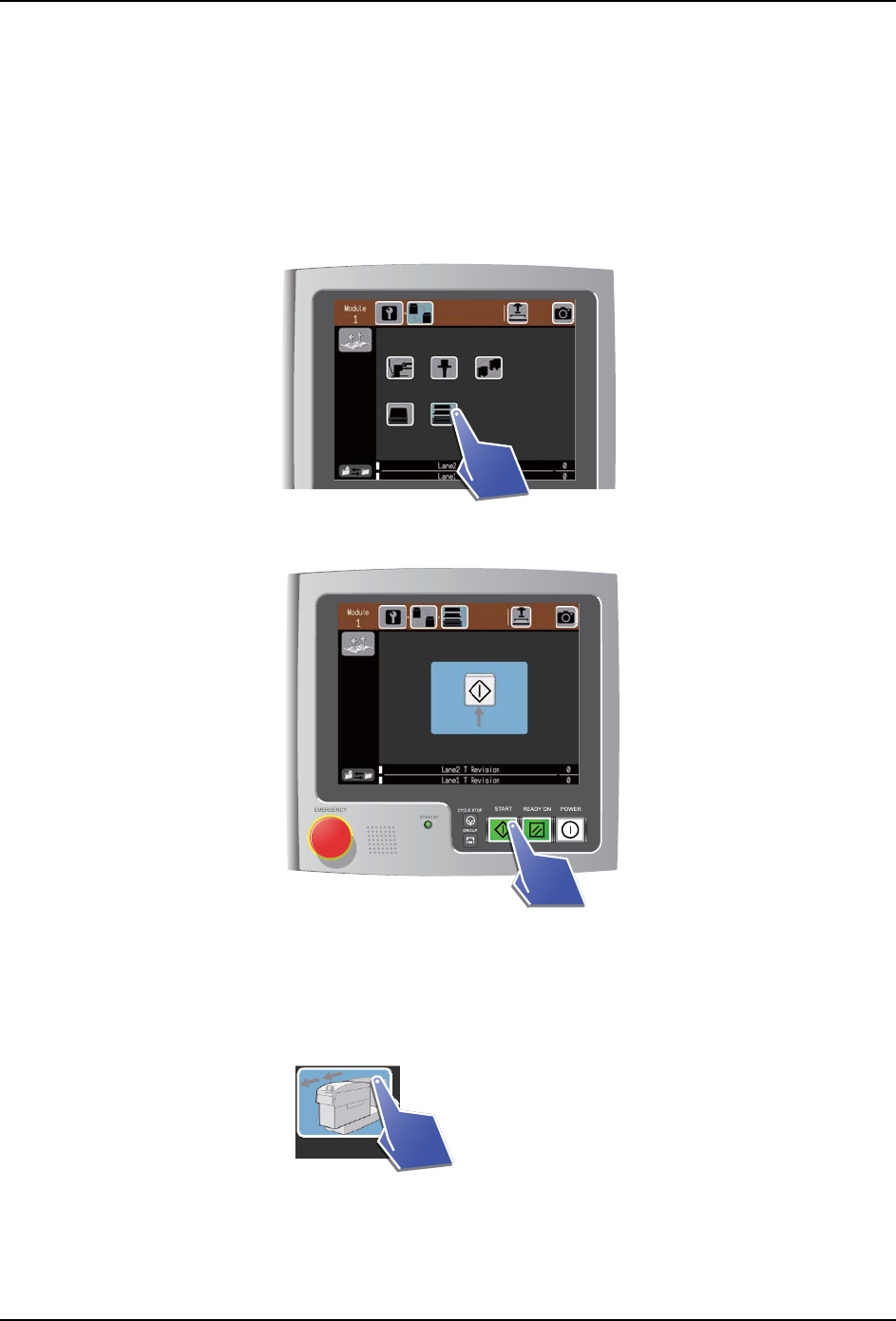 7. 手动模式指令的操作 SYS-NXT3-002S0 286 NXT III 系统手册 6. 请插入模组。 a. 在插入模组之前,请确认 XS 轴 (M3-3)等机械部位没有从模组的旁边突出。 b. 请握住模组的手柄,缓慢地插入模 组,直到碰到阻停块为止。 c. 自动地夹紧模组。没有夹紧时,请 稍微拉回模组然后重新推入。 备注 ) 如果卸下了料盘装置,此处就会显示料盘装置推入向导。 将料盘装置推入到模组后, 就会自动夹紧 。