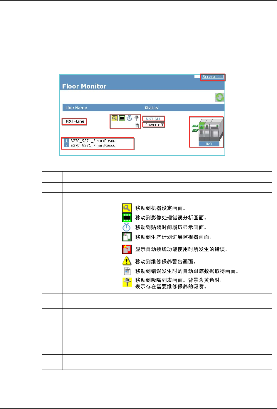 8. 辅助软件 SYS-NXT3-002S0 294 NXT III 系统手册 8.3 在线监控器 在线监控器显示出工厂内 的所有的生产线以及机器的状态。 8.3.1 在线监控器上显示的项目和含义 此画面每 15 秒更新一次,因此始终显示最 新的状态。 号码 名称 说明 1 生产线名 显示生产线名。 2 链接图标 通过点击图标,移动画面。 3 设备名 显示机器名和模组号码。单击 机器名或模组号码后,就会 移动到机器设定画面。 4 模组的…