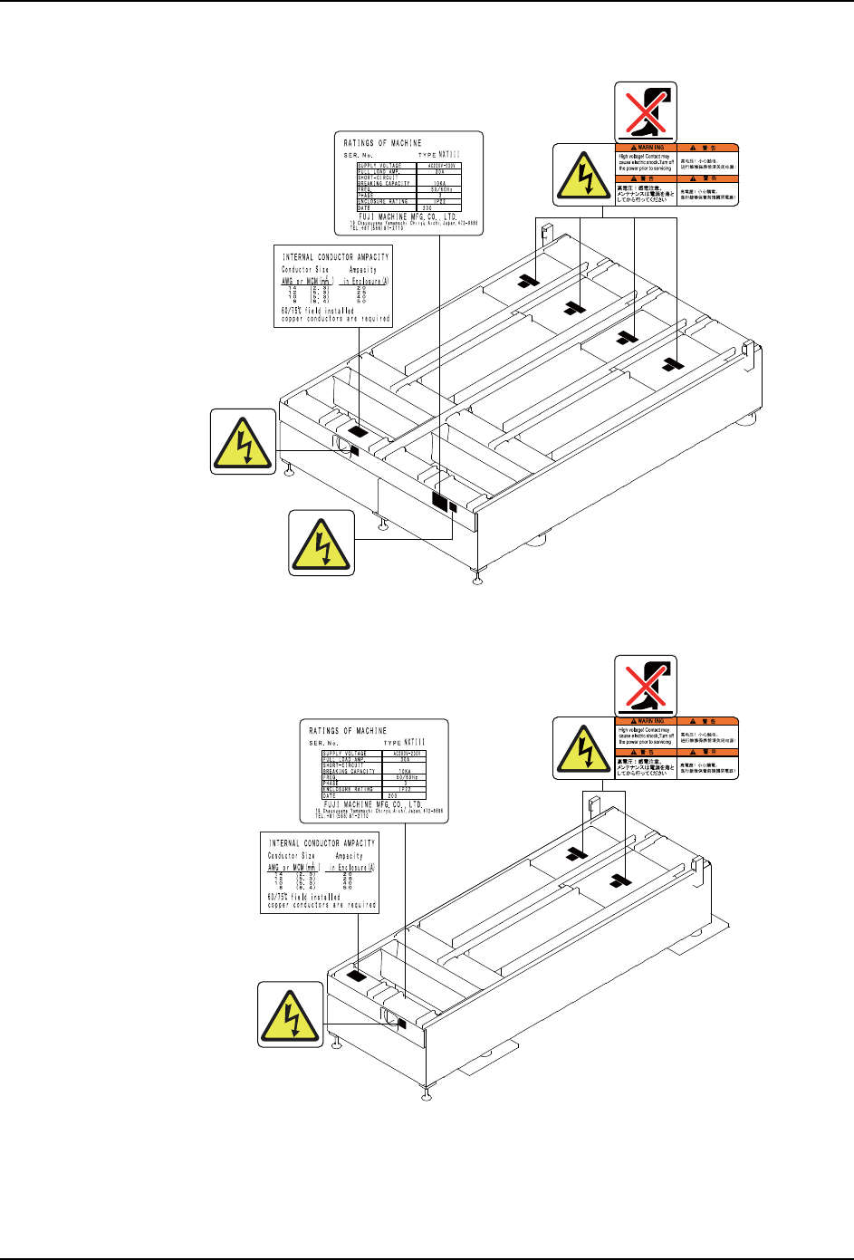 表示使用机器时的注意事项的安全标识贴在机器的下图所示位置。请仔细阅读记载内容,安
