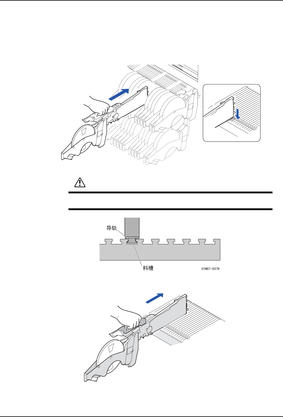 1. 将供料器的前端放置到料站托架的料槽上。