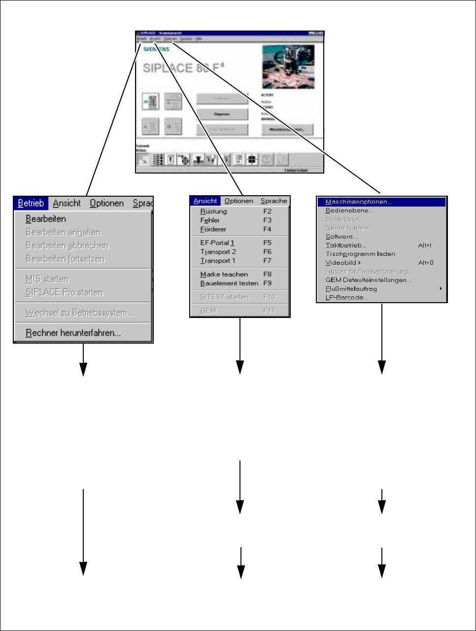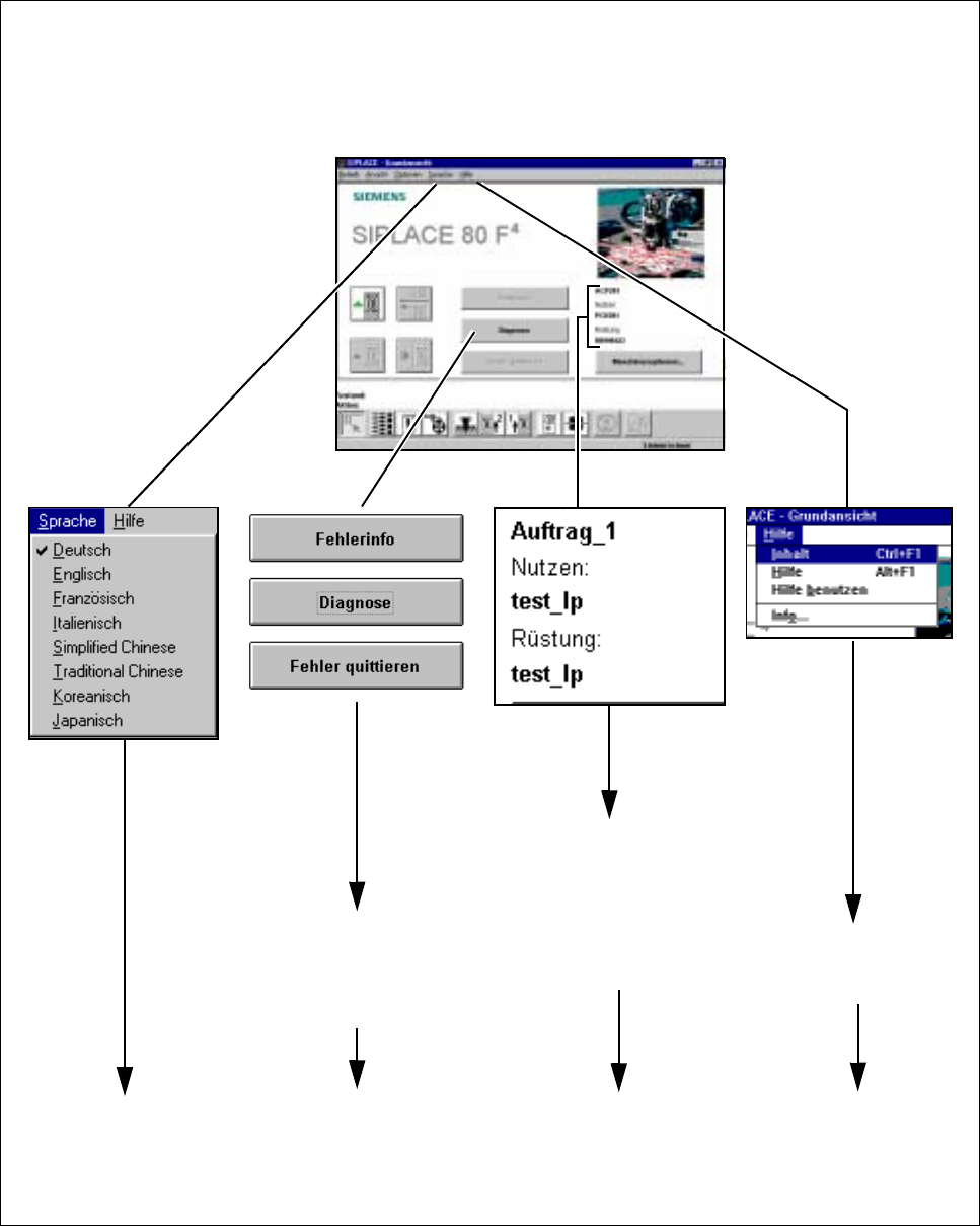 Betriebsanleitung SIPLACE 80S-20/F4/F5 2 Einführung und Grundbegriffe Ausgabe 05/99 ab Softwareversion SR.405.xx 2.3 Die Bedienoberfläche und Menüfunktionen im Überblick 2 - 23 Abb. 2.3.2 Flußplan Gesamtübersicht - T eil…