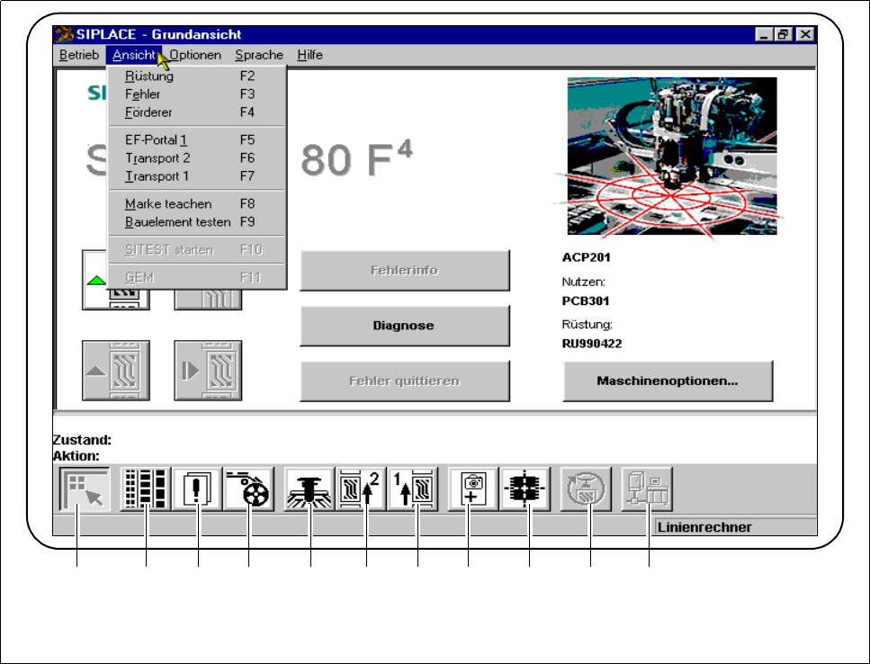Das Menü „Ansicht“ gliedert sich in die Hauptfunktionsgruppen Bestückfunktionen, Einzelfunktionen und