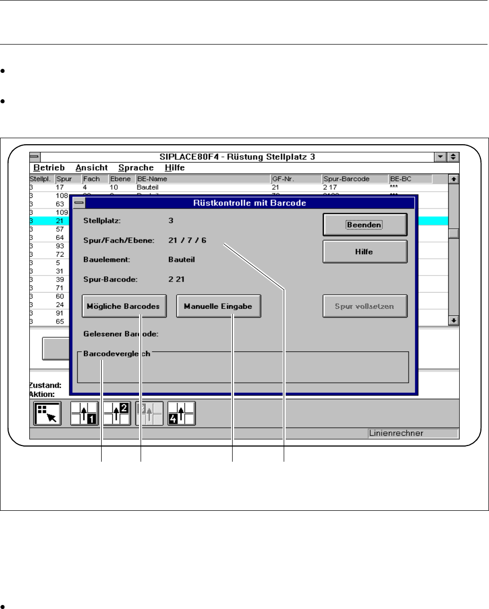 Betriebsanleitung SIPLACE 80S-20/F4/F5 3 Bestückfunktionen Ausgabe 05/99 ab S oftwareversion SR.405.xx 3.2 Rüstung 3 - 9 3.2.2 Rüstkontrolle mit Barcode HINWEIS Nur ak tiv wenn, „ Rüstkon trolle m it Barc ode“ ko nfiguri…