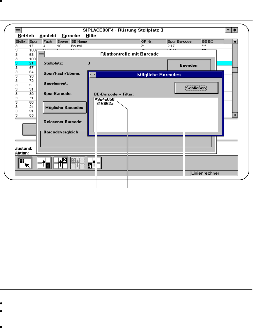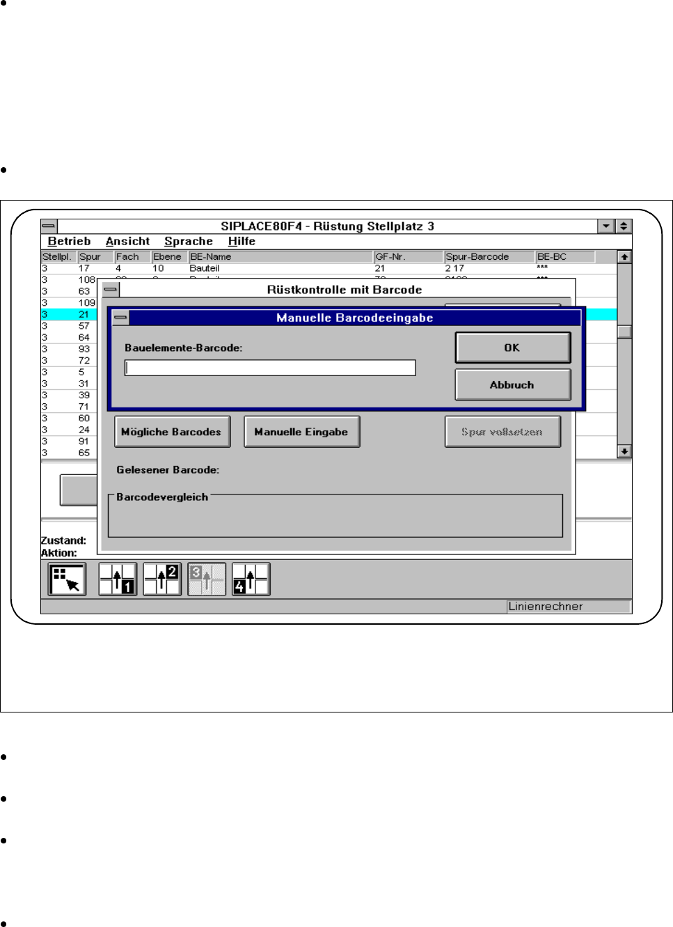 Betriebsanleitung SIPLACE 80S-20/F4/F5 3 Bestückfunktionen Ausgabe 05/99 ab S oftwareversion SR.405.xx 3.2 Rüstung 3 - 11 Wenn der B arcodever gleich überein stimm t und di e Spur leer ist, k licken Sie die S chaltflä ch…