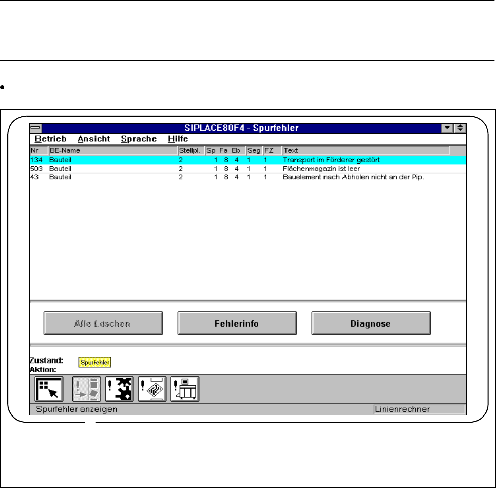 Betriebsanleitung SIPLACE 80S-20/F4/F5 3 Bestückfunktionen Ausgabe 05/99 ab S oftwareversion SR.405.xx 3.3 Fehler 3 - 15 l Seg. In dies er Spal te wird da s Seg ment mit de m das Bauteil b estückt wurde angegeben . l FZ.…