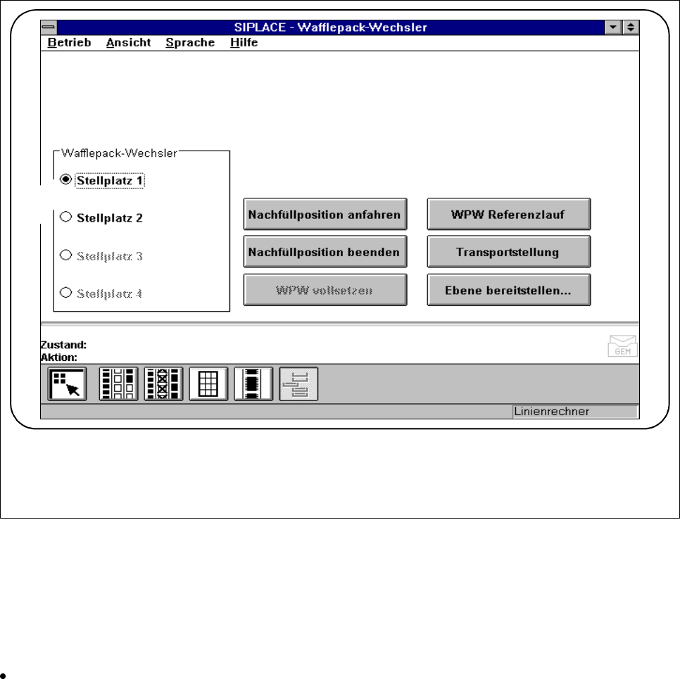 3 Bestückfunktionen B etriebsanleitung SIPLACE 80S-20/F4/F5 3.4 Förderer Ausgabe 05/99 ab Softwareversion SR.405.xx 3 - 30 3.4.5 W afflepack W echsler Funktionen ausführen (Siplace 80F 4 ) Im Menü „ Waf f lepack Wechsler…