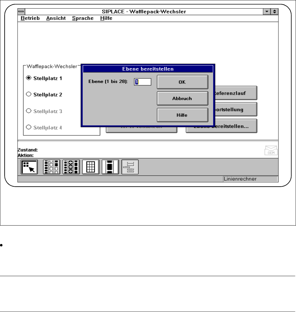 3 Bestückfunktionen B etriebsanleitung SIPLACE 80S-20/F4/F5 3.4 Förderer Ausgabe 05/99 ab Softwareversion SR.405.xx 3 - 32 Abb. 3.4.9 Ebene bereitstellen Geben Si e die Ebene, di e Sie berei tstellen wollen, in das Einga…