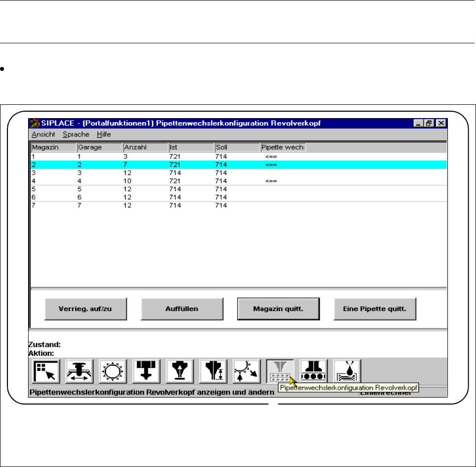 4 Einzelfunktionen Betriebsanleitung SIPLACE 80S-20/F4/F5 4.3 Einzelfunktionen Portal mit 6-er Revolverkopf (nur für 80F5) Ausgabe 05/99 ab Softwareversion SR.405.xx 4 - 40 4.3.7 Pipettenwechsl erkonfiguration 6- er Revo…