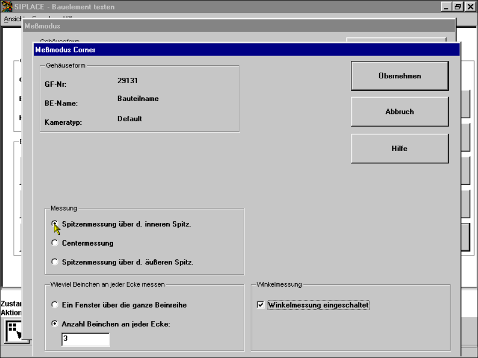 Nach Anklicken der Schaltfläche ’Einstellen’ im Meßmodus ’Corner’ erscheint das Menü ’Meßmodus Corner’.