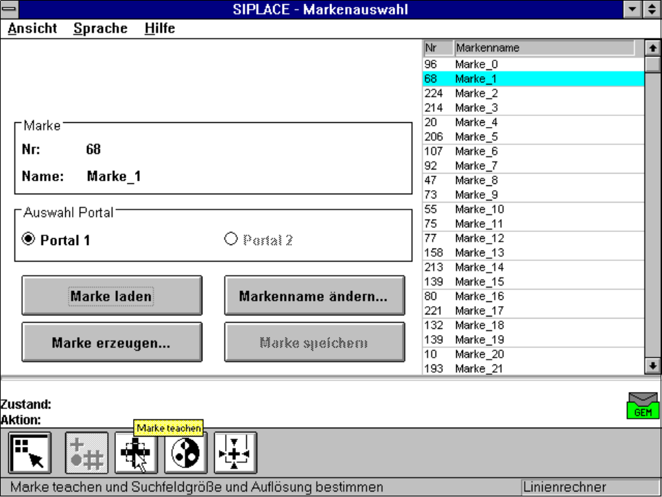 Daher ist im Menü ’Marke teachen’ die Option ’Auswahl Portal’ mit ’Portal 1’ fest vorbelegt. Die Option