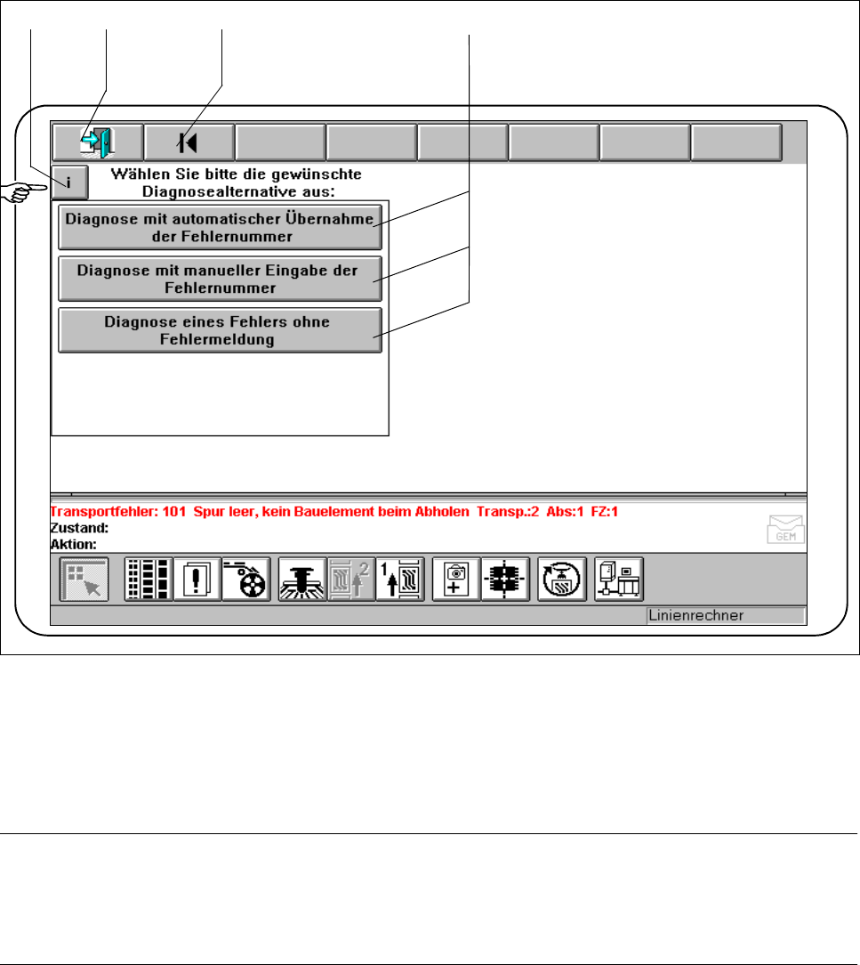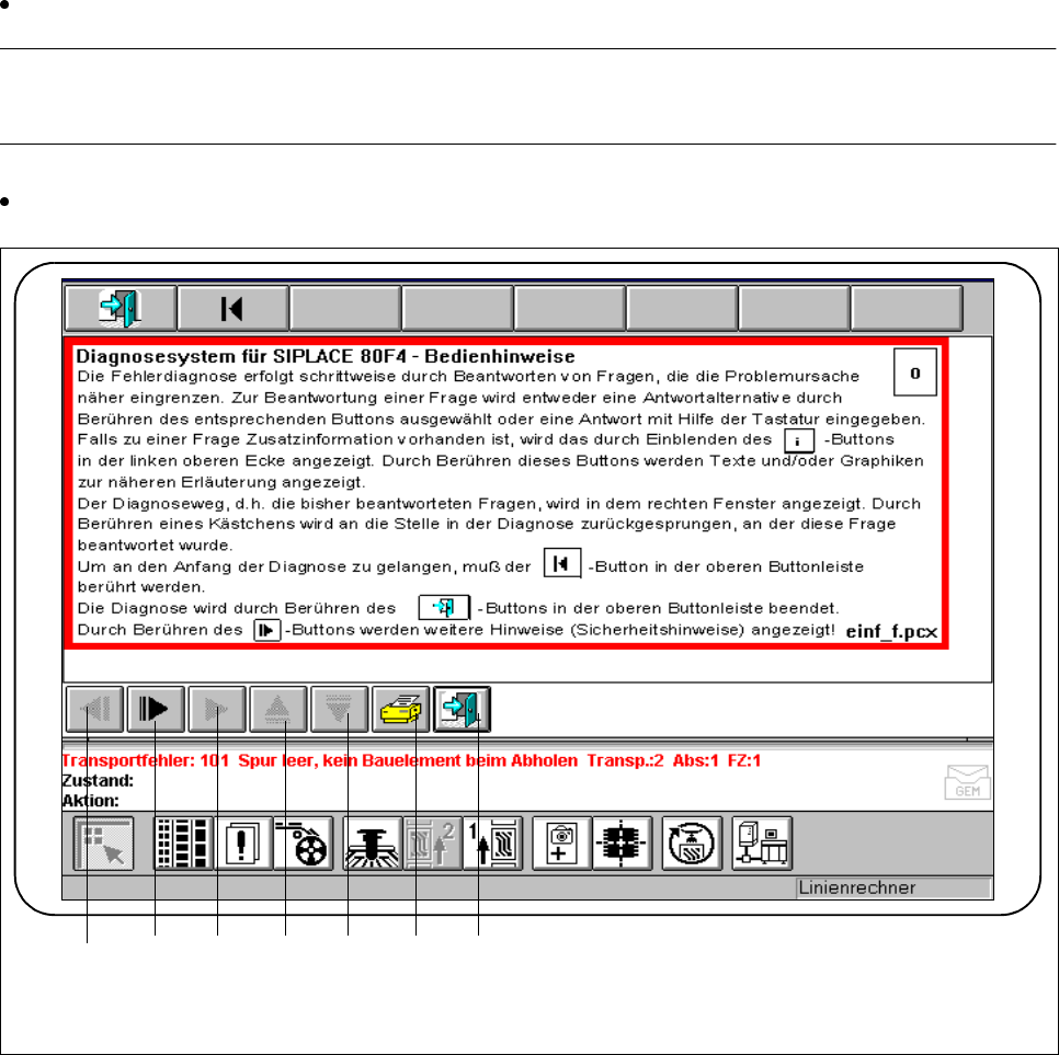 Betriebsanleitung SIPLACE 80S-20/F4/F5 7 Fehlerinfo und Diagnose Ausgabe 05/99 ab Softwareversion SR.405.xx 7.2 Diagnose 7 - 11 Abb. 7.2.2 Grundbildschirm Diagnose - Legende zu Abb. 7.2.2 1 I nfo Button 2 D iagno se been…